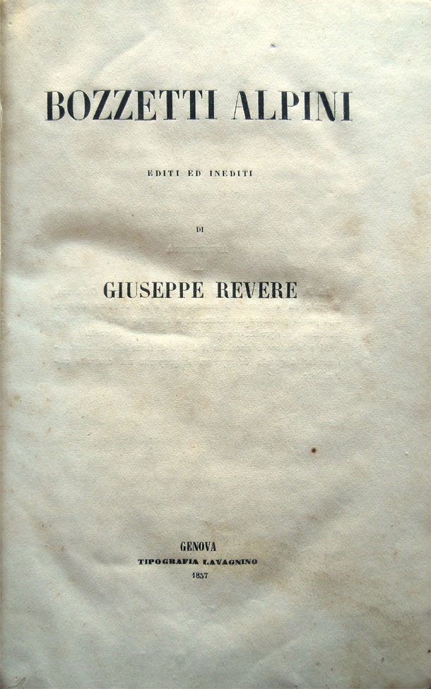 In-8°, pp. XV, (1), 17-344, (4), legatura coeva in mezza pelle con segni d'uso e una piccola mancanza nella parte sinistra della cuffia posteriore. Piccola etichetta coeva in carta, con segnatura erasa, nell'angolo superiore esterno del contropiatto anteriore. Piccolo lavoro di tarlo nel margine inferiore delle pagine, lontano dal testo. Nel margine interno del foglio con le pp. 143-144 e nel margine inferiore di quello con le pp. 261-262, uno strappetto, senza perdite, lontano dal testo, ben rimarginato con carta giapponese. Qualche segno d'umido, per il resto ben conservato. Prima edizione. I bozzetti, definiti dal De Gubernatis "bizzarri, eleganti, vivaci, dottissimi" (De Gubernatis, Dizionario biografico degli scrittori contemporanei, Firenze, Le Monnier, 1878, pp. 872-73) sono una raccolta d'impressioni riguardanti Susa, Vercelli, Chieri, Ivrea, Asti, Genova, messi insieme dall'autore nel suo soggiorno prima a Genova (1856) e poi a Susa. Giuseppe Revere (1812-1889), triestino, partecipò alle lotte risorgimentali a Milano, dove fu al fianco di Cattaneo, a Roma, in compagnia di Mameli e a Venezia; fu pubblicista, poeta, autore teatrale. Oltre a "Bozzetti alpini", probabilmente la sua opera più significativa, e "Marine e paesi", scrisse drammi storici e commedie. Morto a Roma, è ora sepolto nel cimitero ebraico di Trieste.