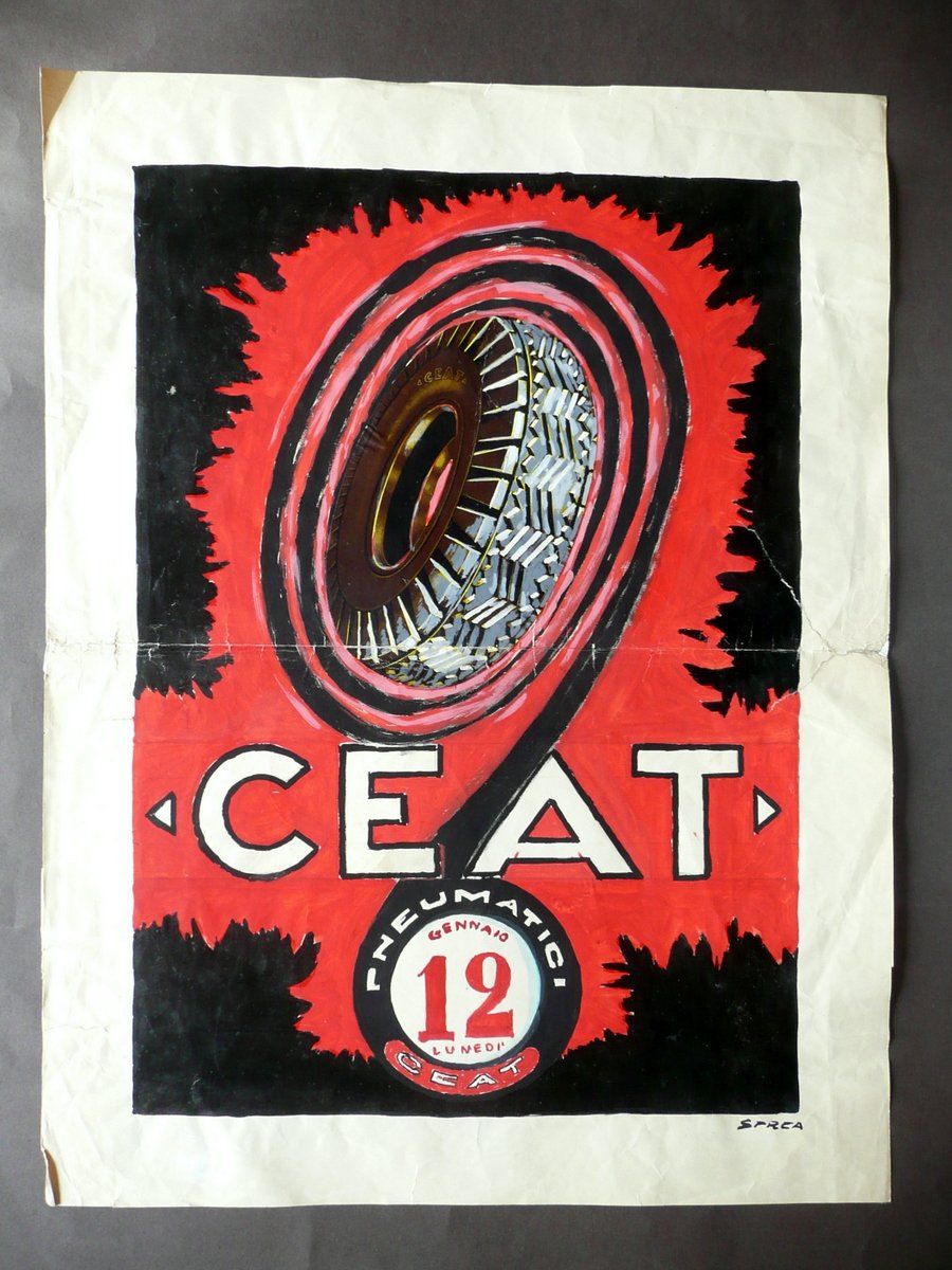 Bozzetto - manifesto, Pneumatici CEAT" Manifesto - Bozzetto pubblicitario a colori (tempera) S. d. (anni '50 del Novecento circa), manifesto - bozzetto pubblicitario a colori su carta (tempera); sezione esterna del pneumatico a stampa a col., sagomata e applicata per mezzo d'incollatura (vedi foto); firmato "Sprea" al margine inf. Cm 50x37,5. Condizioni di conservazione Esemplare complessivamente in buono stato con tracce d'uso, pieghe di conservazione, alcune leggere stropicciature, un margine est. e piega conservativa con qualche strappetto anche di alcuni cm, quasi tutti restaurati al retro mediante l'applicazione di strisce di carta (vedi foto); un angolo sup. con traccia di pieghetta; margine inf. con un paio di piccole macchiette di colore bianco. Firmato "Sprea" al margine inferiore. SC03.D11607 N "