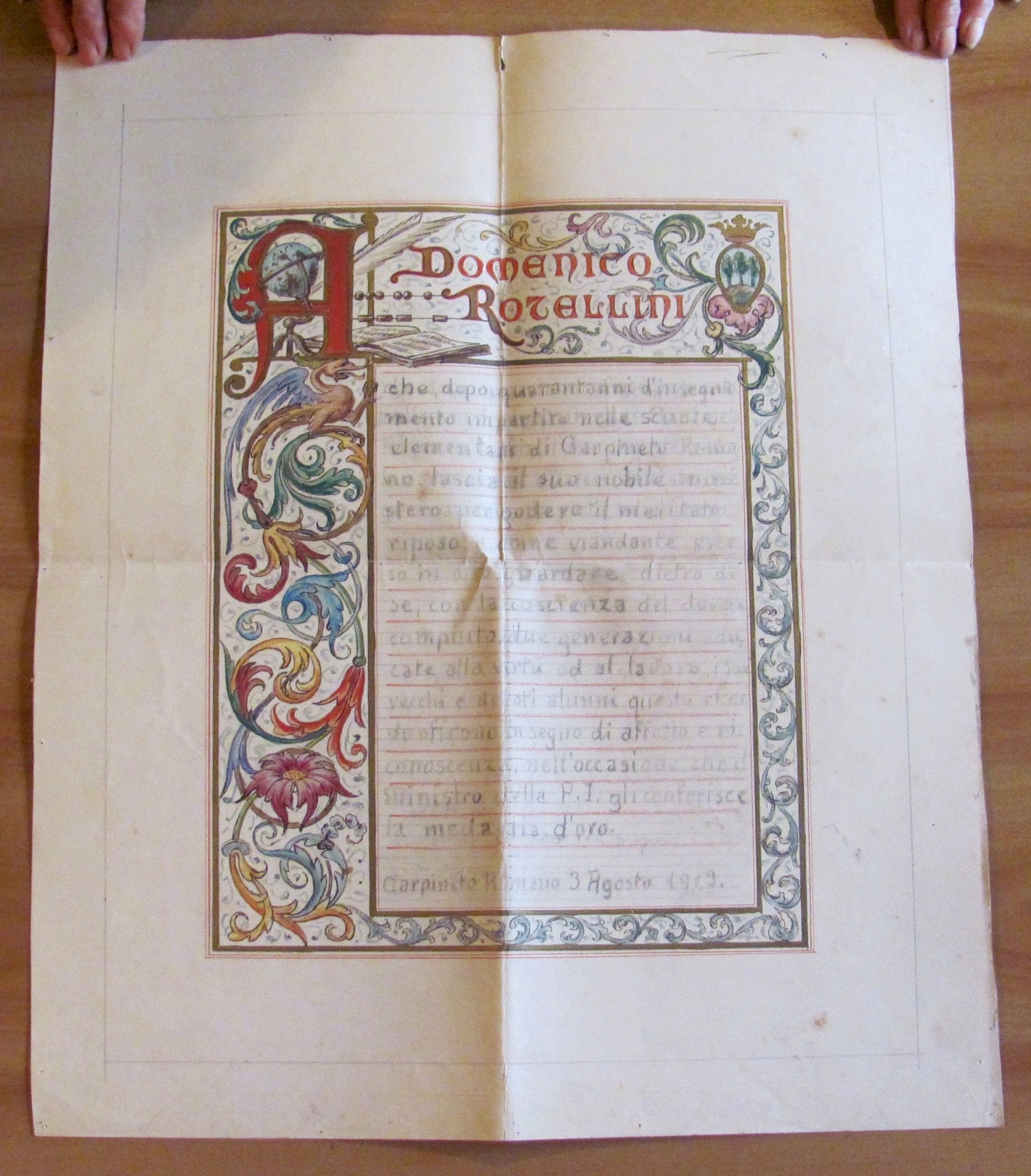 Bozzetto originale per Conferimento della Medaglia d'Oro a Domenico Rosellini per quarant'anni d'insegnamento nelle scuole elementari di Carpineto Romano. Carpineto Romano, 3 Agosto 1913. Non firmato ma di Enrico Battisti. Bel bozzetto in matita, tempera e oro. 45x54. Ottimo stato. Enrico Battisti nato a Rivodutri (RI) nel 1865 fu Pittore, Scultore, Professore di Disegno, Incisore e Litografo. Fin dal 1893 è destinatario dei ringraziamenti del Re e della Regina per i ritratti da lui (già Deputato) inviati ai Reali. Nel 1900 riceve la Medaglia con Diploma di Benemerito dal Re Carol I di Romania. Nel 1936 riceve la Carica di Cavaliere dell'Ordine della Corona. Si allega foto, non in vendita, con documenti e attestati del Battisti. , Ottimo (Fine)