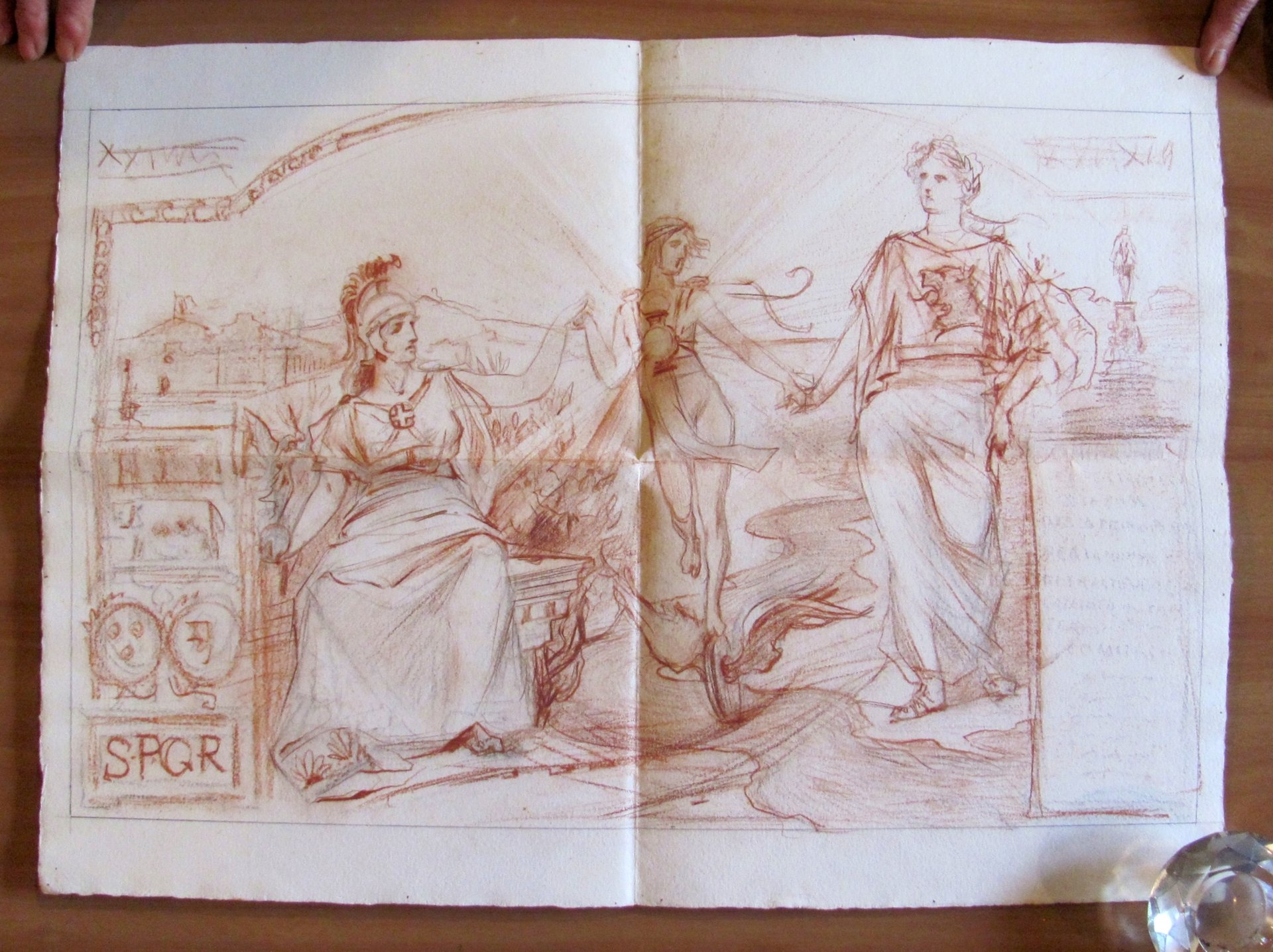 Bozzetto originale in sanguigna con Figure allegoriche e S.P.Q.R. - 1900 ca.