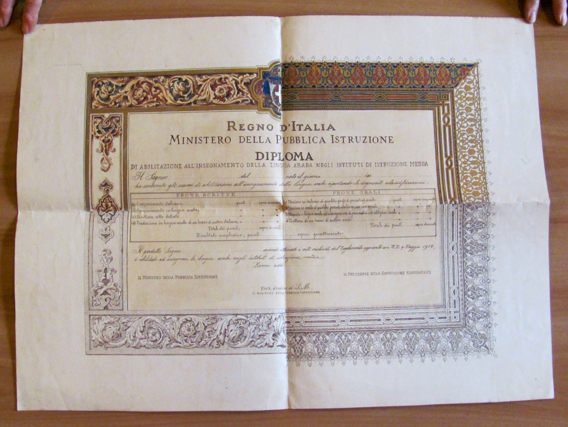 Bozzetto originale - Regno d'Italia - Ministero della Pubblica Istruzione - Diploma di abilitazione all'insegnamento della Lingua Araba negli Istituti di Istruzione Media. Non firmato ma di Enrico Battisti. Bellissimo bozzetto con quattro studi diversi di decorazione e colorazione, in china, tempera e oro, compilato al centro, per la scelta definitiva da dare alla stampa. 62x46. Enrico Battisti nato a Rivodutri (RI) nel 1865 fu Pittore, Scultore, Professore di Disegno, Incisore e Litografo. Fin dal 1893 è destinatario dei ringraziamenti del Re e della Regina per i ritratti da lui (già Deputato) inviati ai Reali. Nel 1900 riceve la Medaglia con Diploma di Benemerito dal Re Carol I di Romania. Nel 1936 riceve la Carica di Cavaliere dell'Ordine della Corona. Si allega foto, non in vendita, con documenti e attestati del Battisti. , Ottimo (Fine)