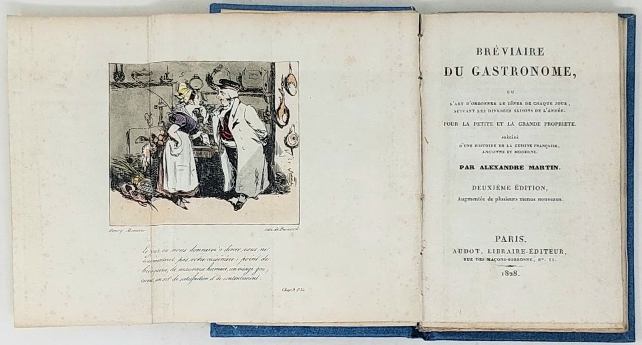 >in-16, pp. 124, (2), legatura moderna tutta tela blu, titolo in oro su tassello al dorso. Con una bella incisione a colori ripiegata in antiporta, d'après Henry Monnier. Interessante manuale per vasti banchetti, con esempi di menù in base alle stagioni. Bell'esemplare. Vicaire, 569. Bitting, 312.