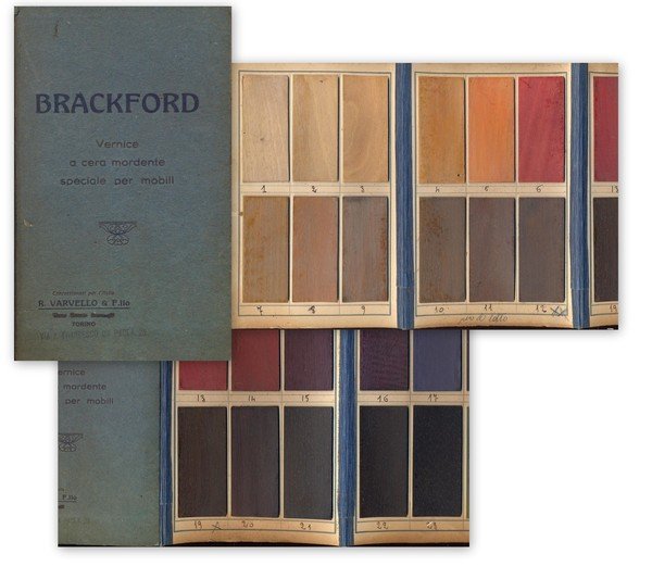 Brackford. Vernice a cera mordente speciale per mobili. Concessionari per l'Italia R. Varvello & F.llo. Catalogo.