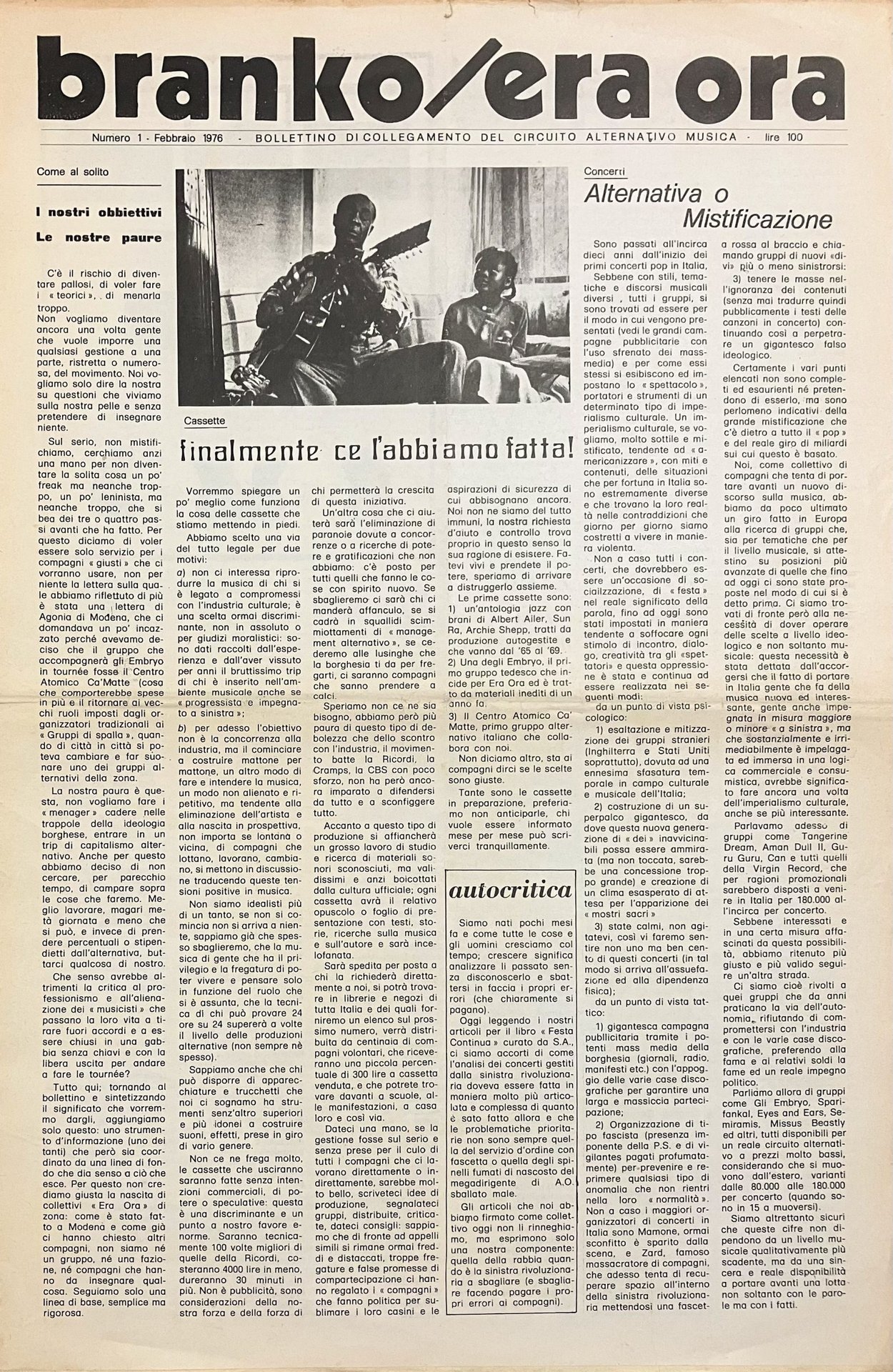 Branko/era ora. Bollettino di collegamento del circuito alternativo musica N. 1