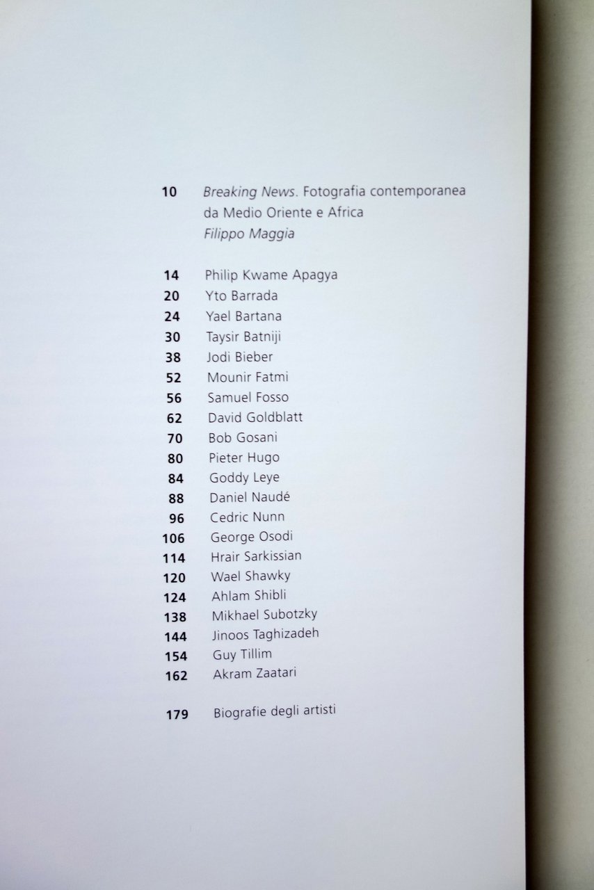 AA. VV., Breaking News fotografia contemporanea da Medio Oriente e Africa a cura di Filippo Maggia con Claudia Fini, Francesca Lazzarini Skira - Fondazione Cassa di Risparmio di Modena, 2010; cm 28x24; pp. 208 con numerosissime ill. fotografiche in b/n e a colori; brossura ed. ill. a colori con bandelle. Condizioni di conservazione Esemplare in ottime condizioni, pressoché mai sfogliato. SETT196.L21327 N