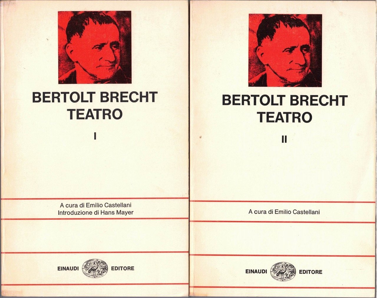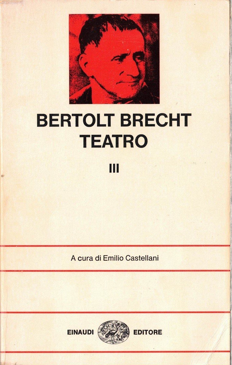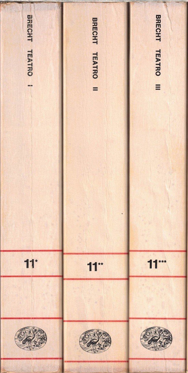 Bertolt Brecht, Teatro, a cura di Emilio Castellani, introduzione di Hans Meyer, Giulio Einaudi editore, Torino 1978, seconda ed., 3 voll., pp. XLI, 2240, cm 18, br. ed. Collana NUE. Nuova serie, vol. 11 (tre tomi). Vol. I: XLI, 731. Vol. II: 738-1534. Vol. III: 1540-2240. Indice vol. I: Introduzione di Hans Mayer – Nota dell’Editore – Baal – Nella giungla delle città – Vita di Edoardo Secondo d’Inghilterra – Un uomo è un uomo – Appendice. L’elefantino – L’opera da tre soldi – Ascesa e rovina della città di Mahagonny – L’accordo – Santa Giovanna dei Macelli. Indice vol. II: Il consenziente e il dissenziente – La linea di condotta – La Madre – L’eccezione e la regola – Gli Orazi e i Curiazi – Teste tonde e teste a punta – Terrore e miseria del Terzo Reich – I fucili di madre Carrar – Madre Courage e i suoi figli – L’interrogatorio di Lucullo – Vita di Galileo. Indice vol. III: L’anima buona di Sezuan – Il signor Puntila e il suo servo Matti – La contenibile ascesa di Arturo Ui – Le visioni di Simone Machard – Svejk nella seconda guerra mondiale – Il cerchio di gesso del Caucaso – I giorni della Comune. Leggero segno di piegatura ai dorsi, minimo alone di nastro adesivo ai frontespizi e a una delle carte bianche finali di ciascuno dei tre volumi, lievissima brunitura della carta, per il resto esemplari molto ben conservati, con brossure solide e interni freschi e puliti.