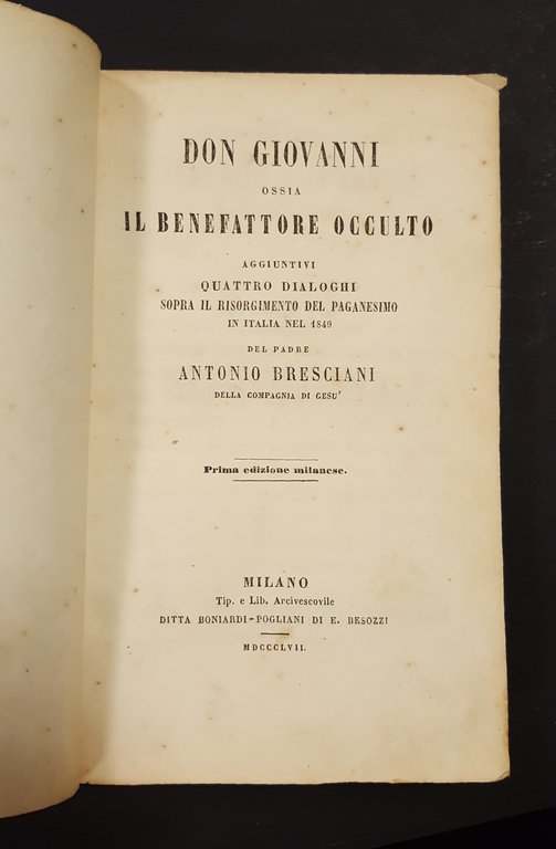 Bresciani Antonio Bresciani Antonio. DON GIOVANNI ossia IL BENEFATTORE OCCULTO. 1857 - I. Milano, Lib. Arcivescovile 1857 - I italiano, in sedicesimo pp. 343 5292