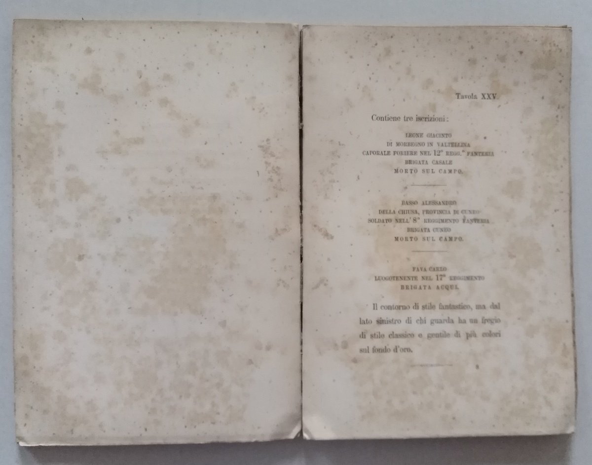 Breve descrizione delle miniature contenute nell'album che si conserva nella Torre di Solferino Tip. D'Ignazio Galeati e Figlio, Imola, 1878; cm. 19x13, pp. 82; br. ed. Condizioni di conservazione Esemplare in buono stato con tracce d'uso e del tempo; brossura editoriale con minime macchiette; dorso fessurato con alcune mancanze (vedi foto); interni con fioriture, qualche fascicolo leggermente allentato. SETT147.L14524 MT P