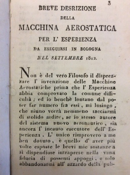 BREVE DESRIZIONE(SIC) DELLA MACCHINA AEROSTATICA PER L'ESPERIENZA DA ESEGUIRSI IN BOLOGNA NEL SETTEMBRE 1812.