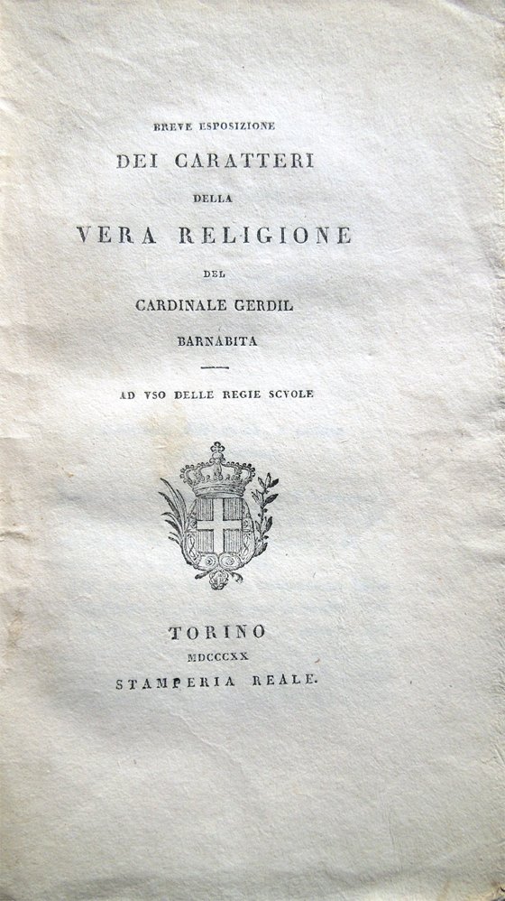 In-16° (18,2 x 10,8 cm), pp. 86, (2), brossura muta coeva, con cognome dell'autore scritto a matita, in corsivo, alla copertina anteriore e, in stampatello maiuscolo, al dorso. Esemplare ben conservato. Indice: Dell'origine, e dei progressi della Religione dalla Creazione del mondo; Considerazione sulla serie degli avvenimenti narrati; Argomento della Divinità del Cristianesimo risultante da' fatti più notorii ed incontrastabili; Religione Cristiana esistente nella Chiesa fondata da Gesù Cristo, propagata dagli Appostoli, e dai loro Successori fino a' dì nostri; Caratteri essenziali della Religione di Cristo permanenti nella Chiesa; La Chiesa di Cristo è Una; La Chiesa di Cristo è Cattolica; La Chiesa di Cristo è Appostolica; La Chiesa di Cristo è Santa; Che il Cattolico solo può vivere sicuro della sua credenza: che gli altri tutti hanno da diffidarne in virtù della Religione stessa, che professano; Delle false Religioni; Dell'Idolatria; Maomettismo; Giudaismo; Chiesa Greca Scismatica; De' Novatori; Considerazioni particolarmente efficaci contro i Novatori. Questo trattato godette di buona fortuna nella sua epoca e fu tradotto nelle principali lingue europee. Giacinto Sigismondo Gerdil, prelato e pedagogista italiano (Samoëns, Savoia, 1718 - Roma 1802), insegnò filosofia all'università di Torino e venne fatto cardinale da Pio VI nel 1787. La sua posizione filosofica deriva, in particolar modo dallo spiritualismo cartesiano e da Malebranche. Nella storia della pedagogia ha una certa importanza la sua presa di posizione contro l'Emilio di J.-J. Rousseau.