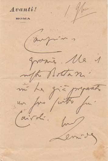 • 1 bifolio, scritta 1 pagina. Manoscritto a inchiostro nero su carta intestata “Avanti! / Roma”. Busta conservata