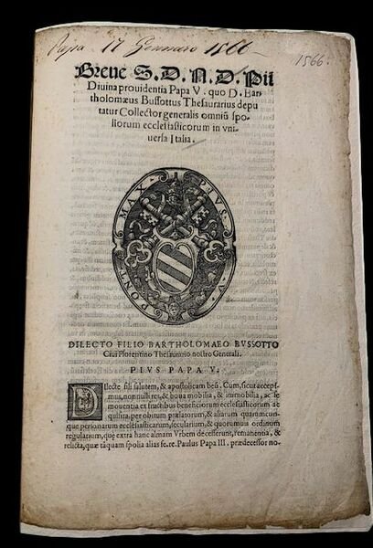 In 4° grande (32x21 cm); (4) pp. Legatura in cartoncino moderno. Due piccoli forellini alla prima carta, ininfluente. Antica nota manoscritta ottocentesca con la data della salita al soglio pontificio di Papa Pio V. Grande stemma di Papa Pio V. Rara bolla papale, probabilmente stampata da Antonio Blado, emesse, pochi giorni dopo la salita al soglio pontificio (7 gennaio 1566) dal noto inquisitore e teologo domenicano, Papa Pio V, al secolo Antonio (in religione Michele) Ghislieri (Bosco Marengo in provincia d'Alessandria, 17 gennaio 1504 – Roma, 1º maggio 1572) che fu il 225º vescovo di Roma. Pio V fu tra i massimi riformatori della Chiesa Cattolica secondo i dettami del Concilio di Trento. Insieme a san Carlo Borromeo e sant'Ignazio di Loyola è considerato tra i principali artefici e promotori della Controriforma. Si adoperò nella difesa del Cattolicesimo dall'eresia attraverso un ampliamento dei diritti giurisdizionali della Chiesa. A lui si deve la scomunica di Elisabetta I d'Inghilterra, nel tentativo di favorire l'ascesa al trono inglese della cattolica Maria Stuart. Riordinò i poteri dei cardinali inquisitori nella bolla Cum felicis recordationis, essendo sempre attento al lavoro degli stessi. A lui si deve anche l'istituzione, nel 1571, della Sacra Congregazione dell'Indice dei Libri Proibiti. La Bolla è diretta al nuovo tesoriere generale della chiesa chiamato dallo stesso Papa Pio V a ricoprire l'importante carica, Bartolomeo Bussetti nato a Bibbiena nel 1520. "Il nome del B. venne assumendo nel corso degli anni un'importanza sempre crescente che culminò, il 17 genn. 1566, nella nomina da parte di Pio V a tesoriere generale della Chiesa. Appena eletto al soglio pontificio, Pio V chiamò il B. a sostituire Donato Matteo Minali sulla cui onestà si nutrivano alcuni dubbi; in effetti il B., esperite le indagini, riscontrò l'esistenza nei libri contabili di gravi irregolarità a danno della Camera apostolica per cui il Minali venne condannato. Il B., che mantenne la carica di tesoriere generale durante tutto il pontificato di Pio V, seppe adeguare le sue direttive economiche alla politica che nel campo dell'amministrazione dello Stato pontificio Pio V voleva perseguire. Il pontefice infatti voleva improntare la sua politica economica a grande parsimonia per quanto riguardava il fasto della corte papale, onde poter apportare alleviamenti fiscali alla popolazione. Infatti fra i primi atti del pontefice, suggeriti dal B., figurano l'abolizione, in Roma, dell'imposta sul vino, la revisione generale di altre tasse, l'abolizione dell'imposta sul macinato nel Patrimonio di San Pietro, dietro una prestazione pecuniaria da pagarsi una sola volta. Inoltre emanò severe prescrizioni contro quegli ufficiali dell'amministrazione che si fossero lasciati corrompere da regalie." dal sito Treccani.it. Proprio in quest'ottica di risparmio e gestione del patrimonio ecclesiastico si inserisce questa bolla pontificia. Rara.