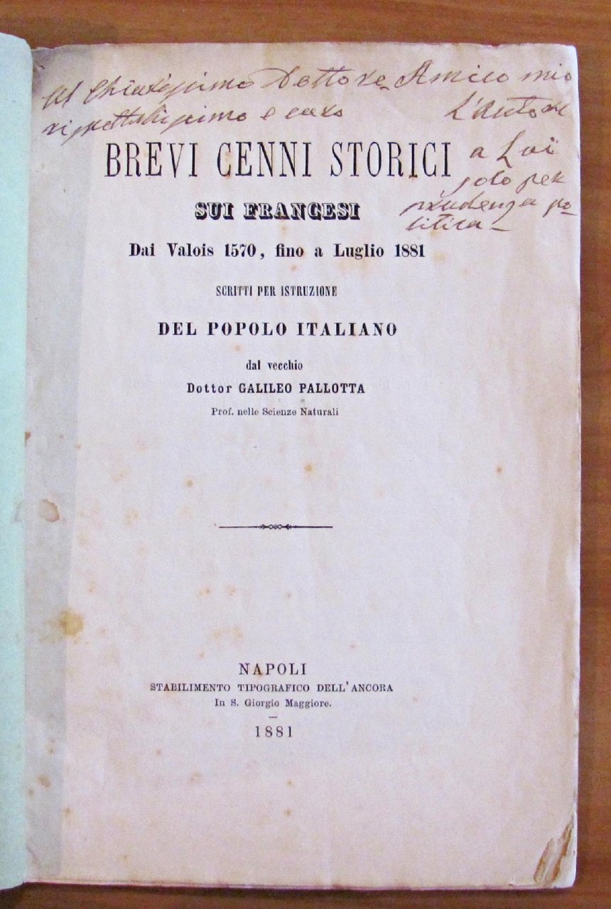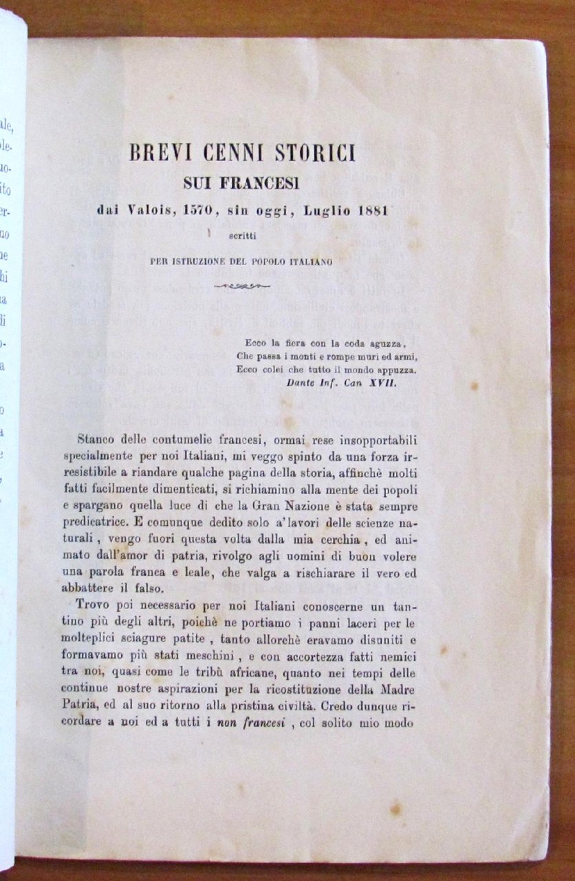 Stabilimento Tipografico dell'Ancora - Napoli, 1881. Brossura editoriale con usure e mancanze al dorso e ai margini delle copertine. Vecchia dedica del tempo al frontespizio. Peraltro interno freschissimo e pulito. 16x23; pp.46. RARO. BUONO STATO , Molto buono (Very Good)