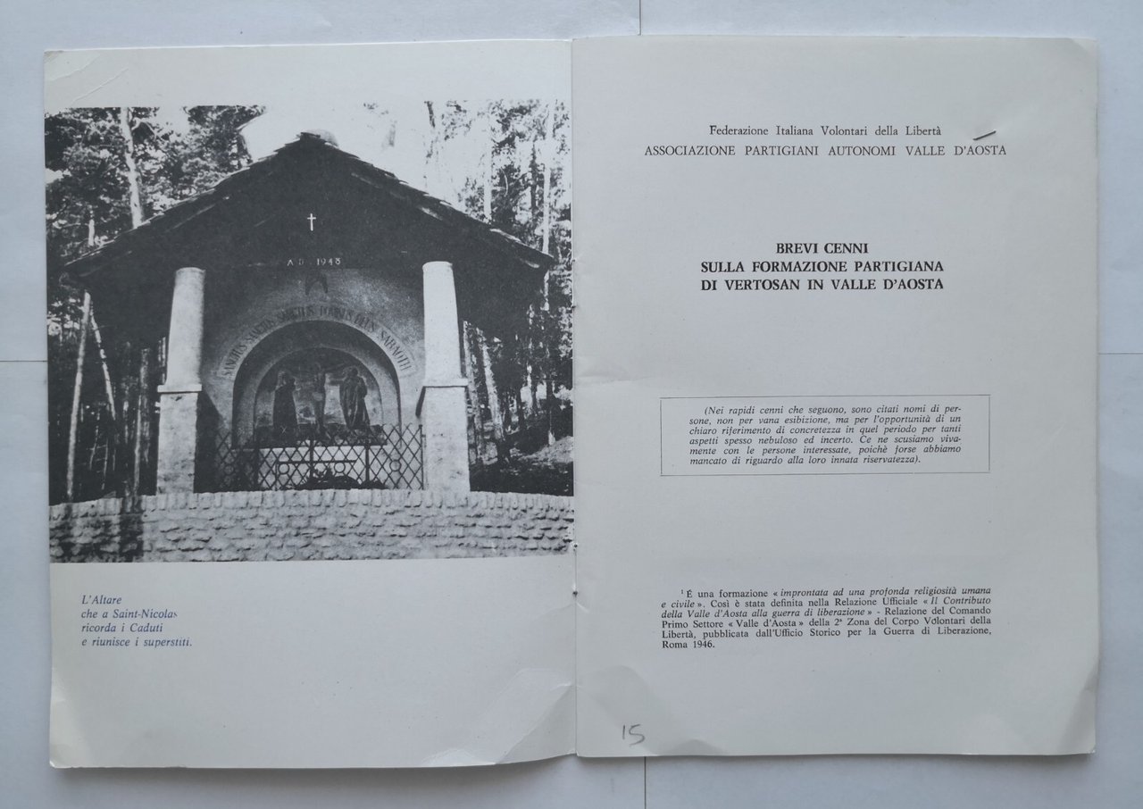 Federazione Italiana Volontari della Libertà, Associazione partigiani autonomi Valle d'Aosta, 1978. 23 pagine. Conserva una cartolina attaccata con la spillatrice. Copertina editoriale in brossura. Stato di conservazione: molto buono (pagine normalmente ingiallite) Libro usato saggistica