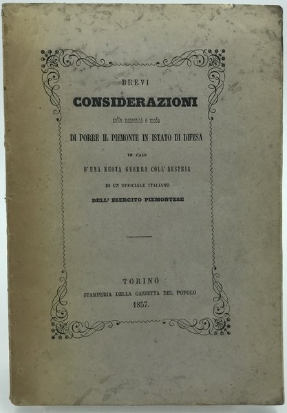 Brevi considerazioni sulla necessità e modo di porre il Piemonte in stato di difesa nel caso dʼuna guerra collʼAustria di un ufficiale italiano dellʼEsercito Piemontese.
