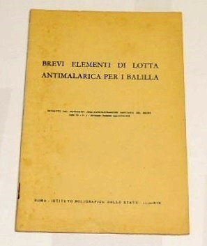 Brevi elementi di lotta antimalarica per i balilla, Istituto Poligrafico dello Stato, Roma 1940, pp. 11, 8 c. di tavv. Ill. col., cm 25. Estratto dal Notiziario dell'Amministrazione Sanitaria del Regno, anno III, n.3, settembre-dicembre 1940.