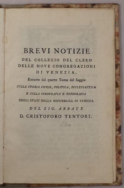 Brevi notizie del collegio del clero delle nove congragazioni di Venezia. Estratto dal quarto tomo del saggio sulla storia civile, politica, ecclesiastica e sulla corografia e topografia degli stati della Repubblica di Venezia del sig. abbate D. Cristoforo Tentori.