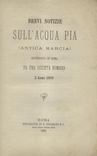 BREVI NOTIZIE SULL'ACQUA PIA (ANTICA MARCIA). Ricondotta in Roma da una società romana l'anno 1870.
