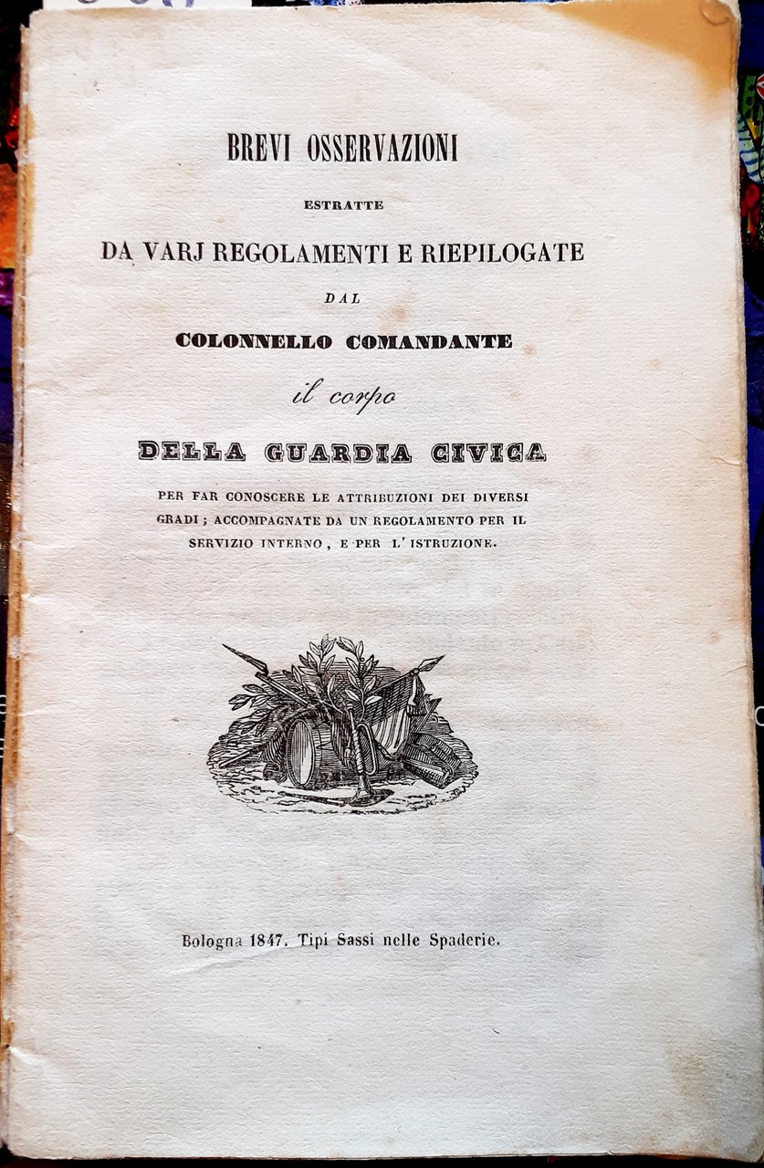 BREVI OSSERVAZIONI ESTRATTE DA VARJ REGOLAMENTI E RIEPILOGATE DAL COLONNELLO COMANDANTE IL CORPO DELLA GUARDIA CIVICA, PER FAR CONOSCERE LE ATTRIBUZIONI DEI DIVERSI GRADI; ACCOMPAGNATA DA UN REGOLAMENTO PER IL SERVIZIO INTERNO, E PER L'ISTRUZIONE.