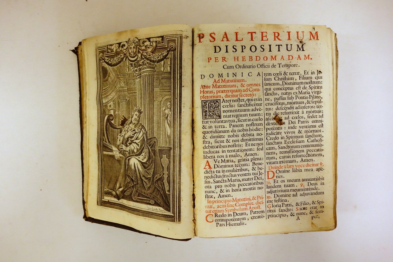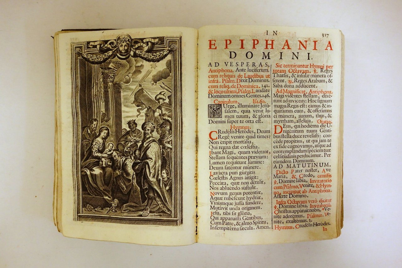 Sumptibus Pauli Balleonii, Venetiis, 1718; cm 23x15,5; pp. [20]-1056-CCLXXXI-[3]; 20 (In Vigilia S. Geminiani Episcopi, et Confessoris); 8 (In Festo Sancti Fidelis a Sigmarinca Protomartyris); 12 (In Festo S. Contardi Estensis Confessoris [...]); 20 (Officium SS. Cordis D. N. Jesu Christi [...]); testo del Breviarium bicolore (rosso e nero), disposto su due colonne, corredato da 6 belle tavv. calcografiche in b/n realizzate da Suor Isabella Piccini (vedi foto); al frontespizio incisione calcografica anch'essa recante la firma della Piccini. Legatura d'epoca in piena pelle muta, con nervature al dorso.