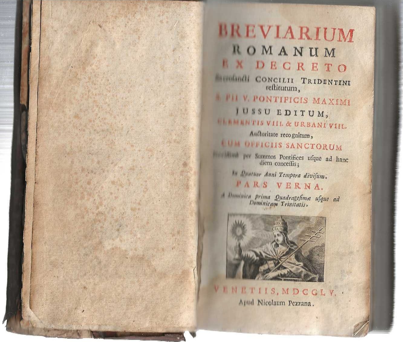Breviarium romanum ex decreto sacrosancti concilii tridentini restitutum s. pii v. pontificis maximi jussu editum clementis viii & urbani viii auctoritate recognitum cum officiis sanctorum novissime per summos pontifices usque ad hanc diem cofices usque ad hanc diem concessis. Pars verna, pars autummnalis,pars hiemalis,pars aestiva
