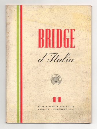 In 16mo (cm 20x14,5). Brossura pag. 40 (da 393 a 433). Tracce di polvere solo sulla copertina. -- Rivista mensile della Federazione Italiana Bridge. N°11 novembre 1957.