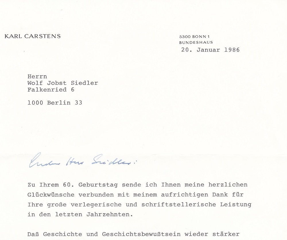 Der Brief des ehemaligen deutschen Bundespräsidenten Karl Carstens richtet sich an den für die alte Bundesrepublik bedeutenden Verleger Wolf Jobst Siedler. Siedler war seit Anfang der 1960er Jahre als konservativ-kritischer Journalist, Essayist und Verleger in Westberlin tätig. Insbesondere seine verlegerische Tätigkeit im Siedler Verlag machte ihn für viele Menschen in der BRD zu einem bedeutenden Zeitgenossen. Im Januar 1986 feierte Siedler seinen 60. Geburtstag, mit Würdigungen in allen wichtigen Medien der westdeutschen Öffentlichkeit. Der Brief wurde von Karl Carstens im Umfeld dieses Jubiläums verfasst, geht jedoch auch über dieses hinaus. Carstens war der fünfte Bundespräsident der BRD in der Periode von 1979 bis 1984. Das Schreiben vom 20. Januar 1986 (handsigniert) umfasst etwa 15 Zeilen. Es trägt im Briefkopf die offizielle Anschrift "5300 Bonn 1, Bundeshaus". Der ehemalige Bundespräsident formuliert zunächst Wünsche zum Jubiläum Siedlers und Dank für dessen "große verlegerische und schriftstellerische Leistung in den letzten Jahrzehnten". Herausragend und bezeichnend ist daraufhin der zweite Absatz des halboffiziellen Briefs an den Verleger: "Daß Geschichte und Geschichtsbewußtsein wieder stärker hervortreten nach den Jahren, in denen beides sträflich vernachlässigt wurde, ist zu einem erheblichen Teil Ihr Verdienst. Besonders danken möchte ich Ihnen für die geistige Hilfe, die Sie Berlin geleistet haben und leisten. Daß Männer wie Sie sich mit dem Schicksal dieser Stadt identifizieren, ist für sie von unschätzbarem Wert." Hier wird neben den Verbindungen zwischen dem konservativen Verleger und Größen der bundesdeutschen Politik auch die Perspektive auf den Umgang mit deutscher Geschichte in der Bevölkerung (der damaligen BRD) sowie der Blick auf das Schicksal der ehemaligen Reichshauptstadt Berlin aus Blickrichtung eines hochrangigen und verdienten CDU-Politikers sichtbar. Sehr interessantes Schriftstück (Unikat) mit Einblick in die Geschichte eines Verlegers und die der Eliten in der alten Bundesrepublik!