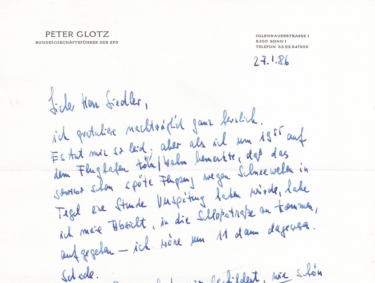 Brief des SPD-Politikers und Publizisten Peter Glotz an den Verleger Wolf Jobst Siedler.