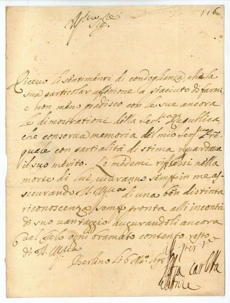 1 S. auf Doppelblatt mit Adresse am Gegenblatt verso (Faltbrief). 4to. An den Patrizier Francesco Cornaro in Venedig, mit Dank für dessen Kondolenz zum Tod ihres am 23. Jänner verstorbenen Vaters Ernst August zu Braunschweig: "Ricevo li sentimenti di condoglianza che la sua particolar affettione a piaciuto di farmi, e non meno gradisco con le sue ancora le dimostrationi della Serenissima Republica, che conserva memoria del mio Serenissimo. Padre [.]". - Faltspuren; ll. Ausriß von Siegelöffnung am Gegenblatt. Wohlerhalten.