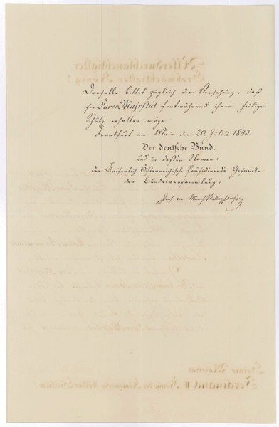 1½ SS. auf Doppelblatt. Folio. Mit Kuvert. Im Namen des Deutschen Bundes an Ferdinand II., König beider Sizilien, dem er zur Geburt einer Tochter, der Prinzessin Maria Annunziata gratuliert: "[.] Gewohnt, an Allem, was Eure Majestät und Ihr Königliches Haus betrifft, lebhaften Antheil zu nehmen, kann der deutsche Bund nur aufrichtigst die Freude theilen, welche dieses Ereigniß Eurer Majestät verursacht hat [.]".