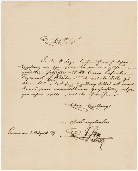 1 S. 4to. An einen namentlich nicht genannten Adressaten: "Euer Exzellenz! In der Anlage beehre ich mich Euer Exzellenz ein Exemplar der von mir zusammengestellten Geschichte des k. k. Linien Infanterie-Regiments Ehz. Wilhelm No. 12 mit der Bitte zu übermitteln, daß Euer Exzellenz selbes als einen Beweis jener unwandelbaren Hochachtung entgegen nehmen wollen, mit der ich verehre Euer Exzellenz stets ergebenster Ehz. Johann | Oberst [.]". - Selten.