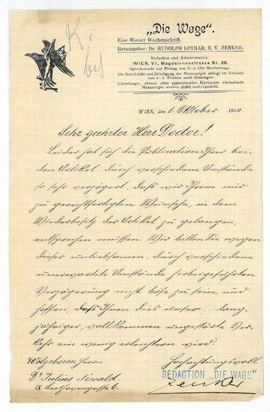 1 S. 8vo. An Julius Newald: "Leider hat sich die Publication Ihrer beiden Artikel durch verschiedene Umstände so sehr verzögert, dass wir Ihrem nur zu gerechtfertigten Wunsche, in den Wiederbesitz der Artikel zu gelangen, entsprechen müssen. Wir bitten Sie wegen dieser unliebsamen, durch verschiedene unerwartete Umstände herbeigeführten Verzögerung nicht böse zu sein, und hoffen, dass Ihnen dies unser langjähriger, vollkommen ungestörter Verkehr etwas erleichtern wird […]". - Auf Briefpapier mit gedr. Briefkopf "Die Wage".