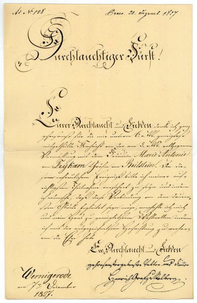 1 S. auf Doppelblatt. Folio. Gratulationsschreiben an den namentlich nicht genannten Fürst Metternich aus Anlass von dessen Hochzeit mit Antonie von Leykam (1806-29), der Tochter des Diplomaten und Komponisten Christoph Ambros Freiherr von Leykam. - Henrich Graf Stolberg, der älteste Sohn von Graf Christian Friedrich zu Stolberg-Wernigerode, studierte in Straßburg und Göttingen und widmete sich anschließend der Verwaltung seiner Güter; daneben bekleidete er mehrere Staatsämter.