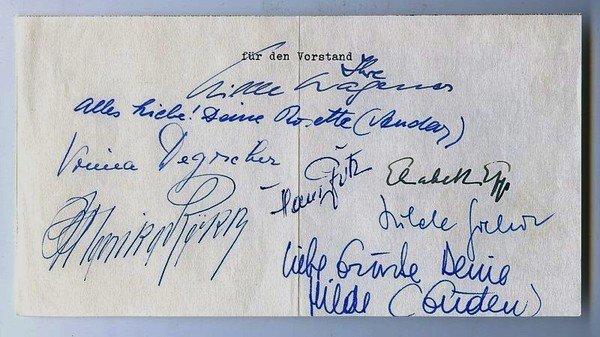1 S. Qu.-schmal.-gr.-8vo. Neben der Schauspielerin Hilde Wagener (1904-1992) - auf deren Initiative hin 1955 der Verein "Künstler helfen Künstlern" für in Not geratene Künstlerkollegen gegründet worden war - unterzeichnen Rosetta Anday, Vilma Degischer, Marika Rökk, Hans Putz, Elisabeth Epp, Hilde Güden und Hilde Sochor.
