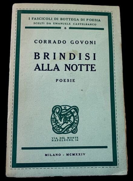 In 8°; 152, (8) pp. Brossura editoriale verde con titolo impresso in nero entro cornice verde. Magnifico esemplare in perfette condizioni di conservazione ed a fogli ancora chiusi. Tiratura limitata di 525 esemplari, il nostro porta il numero 375. Prima edizione di questa celebre raccolta di poesie del grande poeta ferrarese, Corrado Govoni (Tamara, 29 ottobre 1884 Lido dei Pini, 20 ottobre 1965). Fra i poeti crepuscolari in gioventù, aderì in seguito al futurismo divenendone uno dei rappresentanti di punta pur continuando a mantenere nella sua produzione letteraria aspetti dannunziani, immagini liberty e crepuscolari affiancando toni tipici del modernismo futurista nelle descrizioni degli ambienti cittadini, lidillio dei paesaggi campestri a lui cari per la sua sensibilità di uomo cresciuto in campagna. Scrive Riccardo DAnna nel Dizionario Biografico degli Italiani (Volume 58, 2002) che Govoni è una Figura a suo modo emblematica di scrittore poligrafo e prolifico, il G. attraversò con originalità il complesso universo che si andava muovendo intorno alla nuova poesia, sorta nella prima quindicina del secolo, attraversando Pascoli e DAnnunzio, ma soprattutto direttamente partecipando tanto al movimento futurista (collaborò ai Quaderni di poesia, diretti da F.T. Marinetti) quanto, facendo tesoro delle esperienze simboliste e tardo-simboliste in chiave impressionistica e crepuscolare, secondo il credo di una poesia il cui fine non è certo analizzare e descrivere ma puntare piuttosto verso lineffabile, evocare sensazioni. Il G. collaborò, inoltre, a La Voce e a Lacerba, ma pubblicò anche su diverse altre riviste, fra cui Riviera ligure di M. Novaro e, dal 1916, sulla rivista partenopea La Diana di G. Marone, che per prima ospitò e diffuse lesperienza dei poeti ermetici. Già C. Bo individuava quale punto determinante nella poesia govoniana la sua stupefacente natura di scrittore: una natura talmente ricca e sovrabbondante da impedire una classificazione esatta o caso mai portata piuttosto a sollecitare una continua collusione con le ragioni del tempo (p. 314).. Raro a reperirsi in queste ottime condizioni di conservazione e a fogli chiusi.