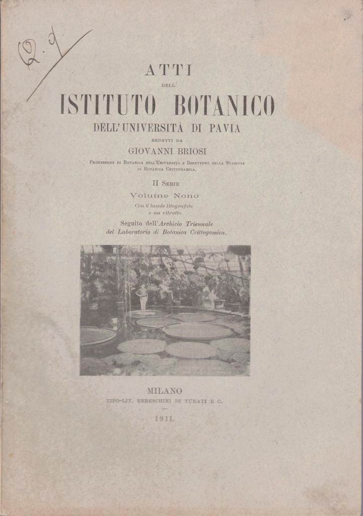 Giovanni Briosi, Cenno sopra Bonaventura Corti. Con ritratto, Tipo-Lit. Rebeschini di Turati e C., Milano 1911, paginazione varia per un totale di pp. 16 con numerazione differente (X, f), 1 c. di tav. f.t. coperta da velina e ill. b.n. con ritratto di Bonaventura Corti, cm 28, br. ed. Titolo ricavato dalla prima pagina di testo. In testa alla prima pagina di testo: Istituto Botanico della R. Università di Pavia e Laboratorio Crittogamico Italiano diretti da Giovanni Briosi. Estratto da: Atti dell’Istituto Botanico dell’Università di Pavia redatti da Giovanni Briosi. II Serie. Volume nono. Seguito dell’Archivio Triennale del Laboratorio di Botanica Crittoganica, Tipo-Lit. Rebeschini di Turati e C., Milano 1911, paginazione varia per un totale di pp. 16 con numerazione differente (X, f), 1 c. di tav. f.t. ill. b.n. con ritratto di Bonaventura Corti, cm 28, rilegatura a punto metallico. Sigla di appartenenza a margine del frontespizio. Brossura un po’ sporca, minima brunitura della carta, per il resto ben conservato.