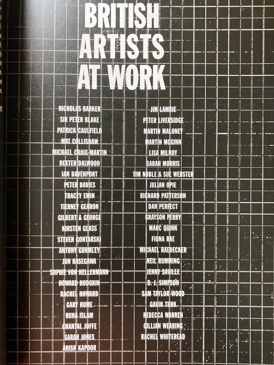 - Nicholas Barker, Sir Peter Blake, Patrick Caulfield, Mat Collishaw, Michael Craig-martin, Dexter Dalwood, Ian Davenport, Peter Davies, Tracey Emin, Tierney Gearon, Gilbert & George, Kirsten Glass, Steven Gontarski, Antony Gormley, Jun Hasegawa, Sophie Von Hellermann, Howard Hodgkin, Rachel Howard, Gary Hume, Runa Islam, Chantal Joffe, Sarah Jones, Anish Kapoor, Jim Lambie, Peter Liversidge, Martin Maloney, Martin Mcginn, Lisa Milroy, Sarah Morris, Tim Noble, Sue Webster, Julian Opie, Richard Patterson, Dan Perfect, Grayson Perry, Marc Quinn, Fiona Rae, Michael Raedecker, Neil Rumming, Jenny Saville, D. J. Simpson, Sam Taylor-wood, Gavin Turk, Rebecca Warren, Gillian Wearing, Rachel Whiteread