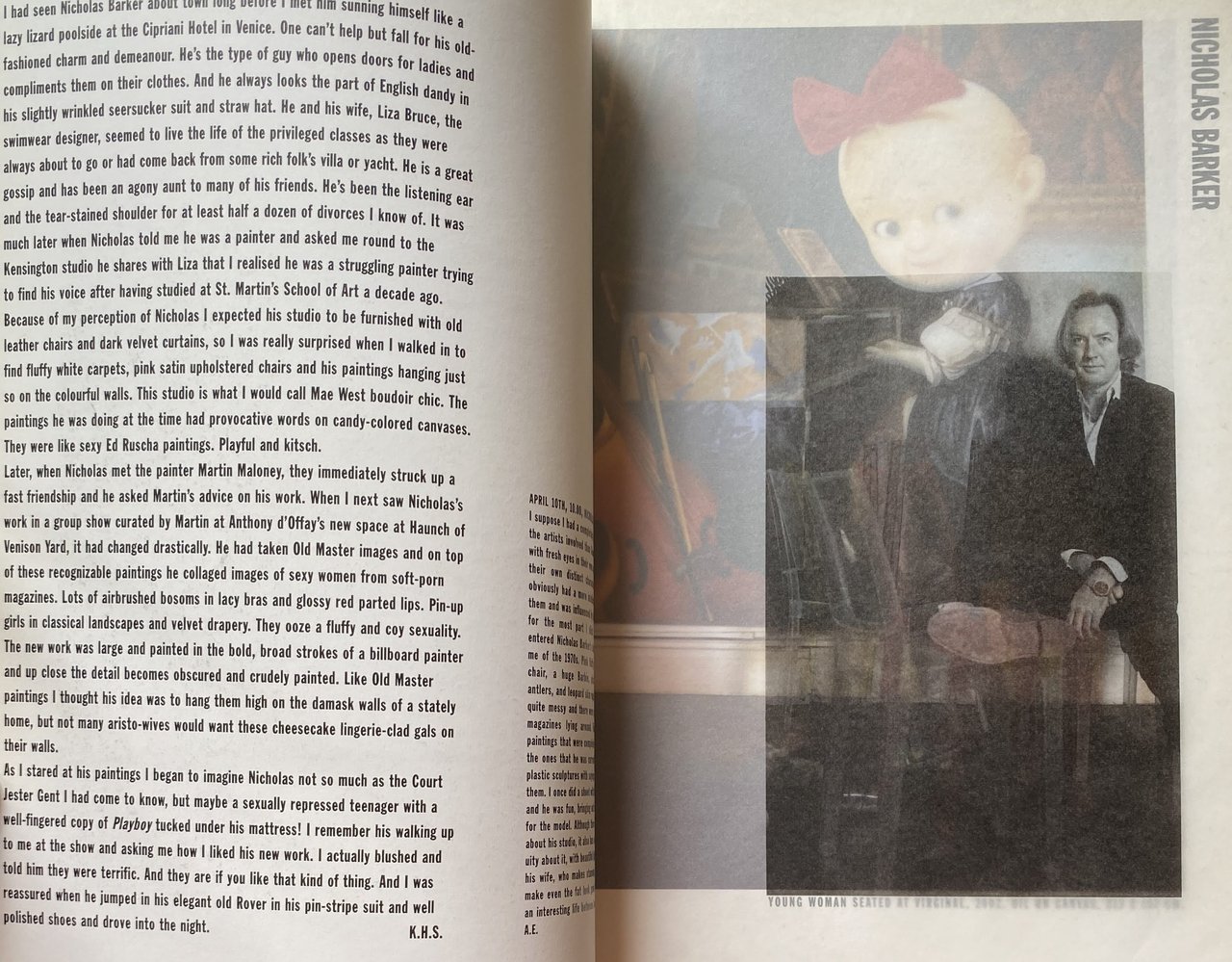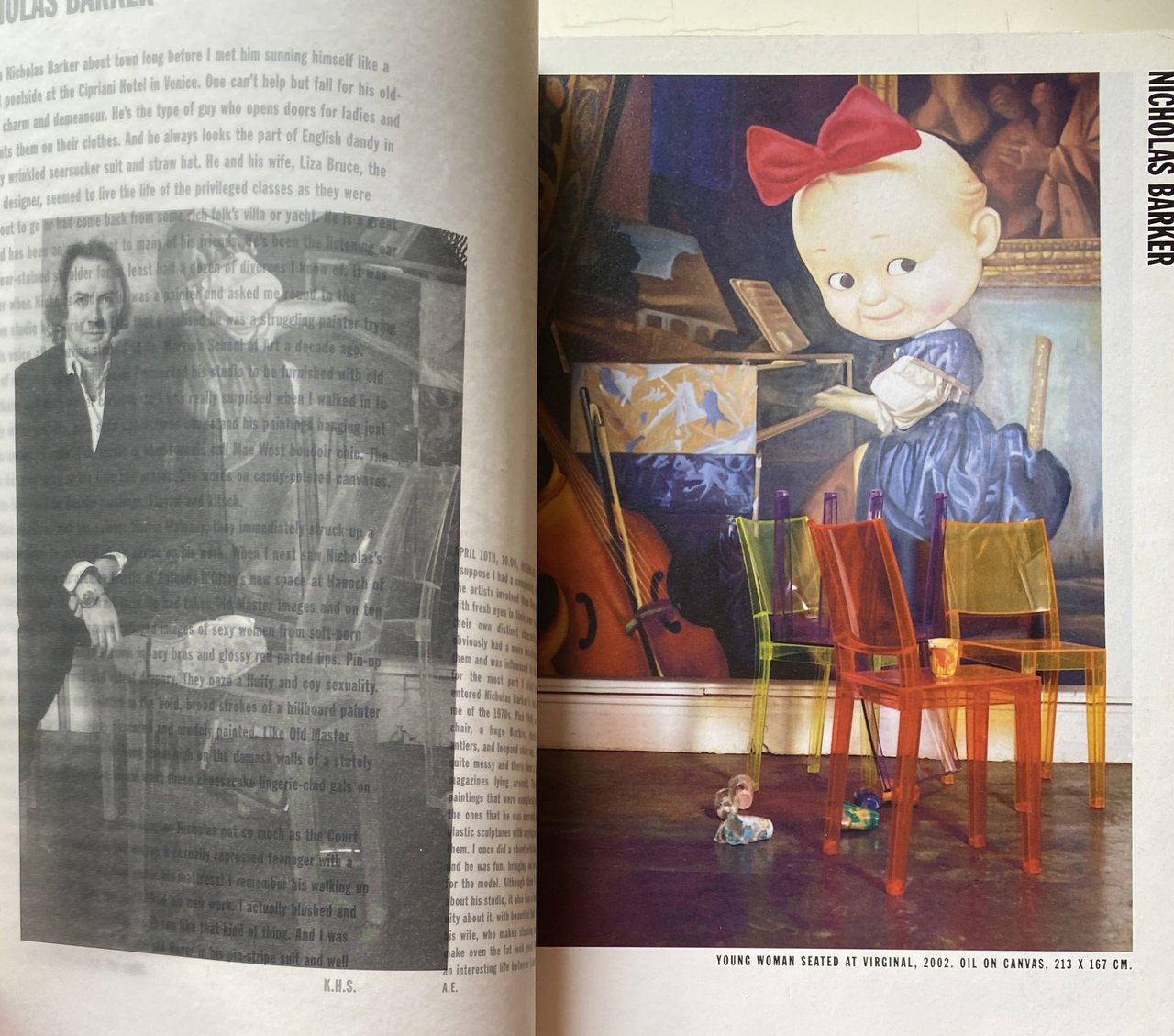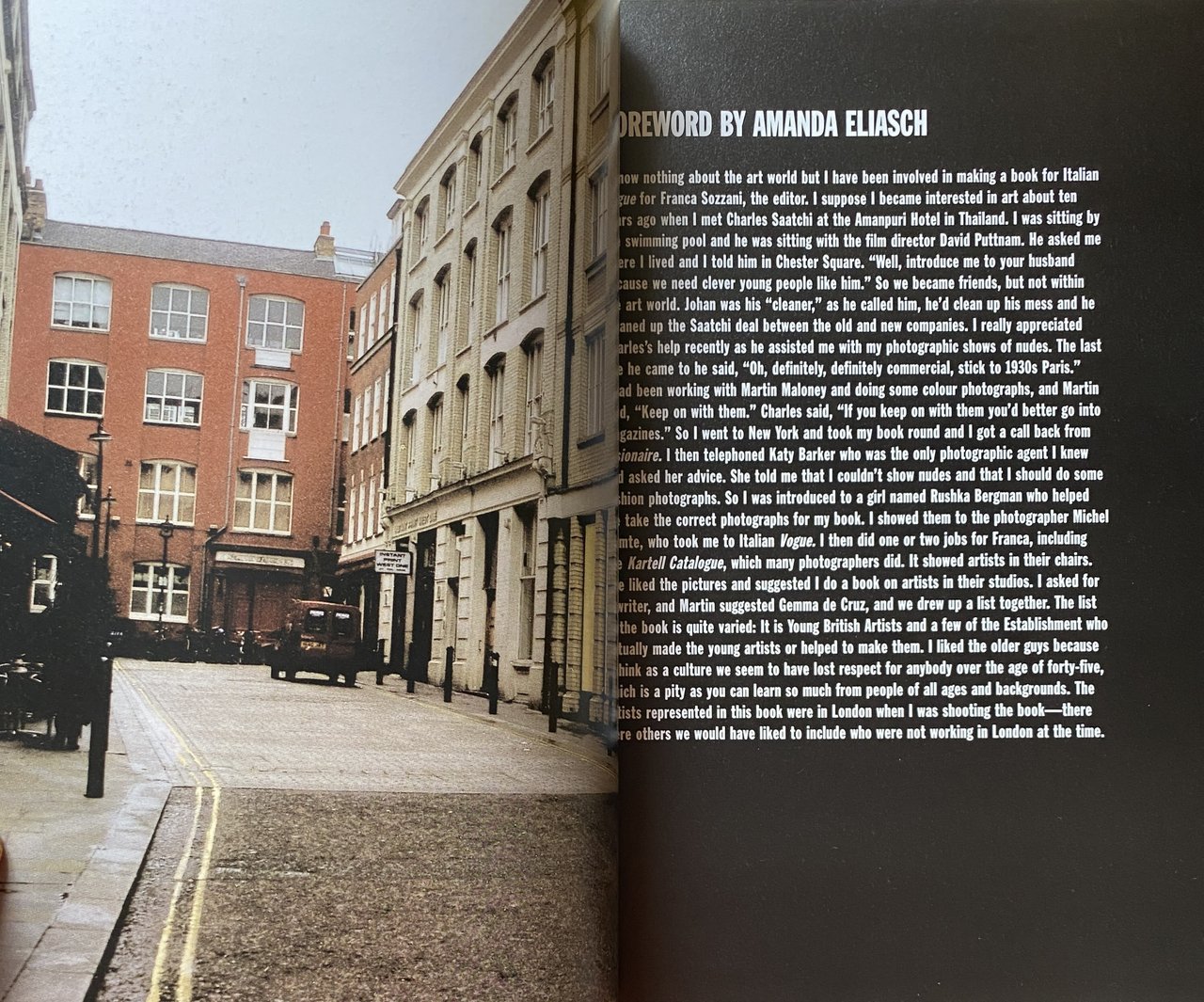 I know nothing about the art world but I have been involved in making a book for Italian Vogue for Franca Sozzani, the editor. I suppose I became interested in art about ten years ago when I met Charles Saatchi at the Amanpuri Hotel in Thailand. I was sitting by the swimming pool and he was sitting with the film director David Puttnam. He asked me where I lived and I told him in Chester Square. "Well, introduce me to your husband because we need clever young people like him." So we became friends, but not within the art world. Johan was his "cleaner," as he called him, he'd clean up his mess and he cleaned up the Saatchi deal between the old and new companies. I really appreciated Charles's help recently as he assisted me with my photographic shows of nudes. The last one he came to he said, "Oh, definitely, definitely commercial, stick to 1930s Paris." I had been working with Martin Maloney and doing some colour photographs, and Martin said, "Keep on with them." Charles said, "If you keep on with them you'd better go into magazines." So I went to New York and took my book round and I got a call back from Visionaire. I then telephoned Katy Barker who was the only photographic agent I knew and asked her advice. She told me that I couldn't show nudes and that I should do some fashion photographs. So I was introduced to a girl named Rushka Bergman who helped me take the correct photographs for my book. I showed them to the photographer Michel Comte, who took me to Italian Vogue. I then did one or two jobs for Franca, including the Kartell Catalogue, which many photographers did. It showed artists in their chairs. She liked the pictures and suggested I do a book on artists in their studios. I asked for a writer, and Martin suggested Gemma de Cruz, and we drew up a list together. The list in the book is quite varied: It is Young British Artists and a few of the Establishment who actually made the young artists or helped to make them. I liked the older guys because I think as a culture we seem to have lost respect for anybody over the age of forty-five, which is a pity as you can learn so much from people of all ages and backgrounds. The artists represented in this book were in London when I was shooting the book-there were others we would have liked to include who were not working in London at the time.