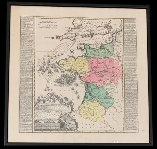 In folio (54.4 x 64.3 cm il foglio); esemplare in fine coloritura coeva ed in ottime condizioni di conservazione. Testo in tedesco e francese in cartiglio posto ai lati della carta. Cartiglio con titolo al margine basso dello stampa. Magnifica e vivida tiratura di questa celeberrima carta del territorio delle coste francesi e meridionali inglesi che illustra il percorso delle flotte inglesi e francesi che si sarebbero poi scontrare nella celeberrima battaglia, avvenuta durante la Guerra dei Sette Anni, nella Baia di Quiberon il 20 novembre del 1759, battaglia che è rappresentata appunto nel lato sinistro della carta. Lo scontro fra le flotte francese ed inglese si svolse presso la baia di Quiberon, vicino a Saint-Nazaire, di fronte al Golfo di Morbihan. La flotta francese era comandata dall'ammiraglio Hubert de Brienne, conte di Conflans e quella britannica, dall'ammiraglio Edward Hawke. La battaglia terminò con una netta vittoria della squadra navale britannica. "La potenza della flotta francese fu fortemente compromessa e non si riprese prima della fine della guerra; nelle parole di Alfred Thayer Mahan (L'influenza del potere navale nella storia), la battaglia del 20 novembre 1759 « fu la Trafalgar di quella guerra [ ] la flotta inglese era ora in grado dii agire contro le colonie della Francia e più tardi di quelle della Spagna, su scala molto maggiore che mai prima.» Per esempio la Francia non poteva approfittare della sua vittoria di Sainte-Foy del 1760, nella terra che è oggi il Canada, poiché là necessitava di rifornimenti e rinforzi dalla Francia, e così la battaglia della baia di Quiberon può essere vista come l'evento che determinò il destino della Nuova Francia e quindi del Canada". La carta fu stampata dal successore e cognato del grande cartografo Matthaus Seutter (sposò una delle figlie di Seutter), il cartografo, editore ed incisore Tobias Conrad Lotter (1717 - 1777). Lotter, si formò alla bottega di Matthaus Seutter per il quale lavorò. Alla morte di Seutter ne rilevò lattività che portò avanti fino al 1777 anno della sua morte. Lattività passo poi al figlio, Matthias Albrecht Lotter. Tobias Conrad fu uno dei più apprezzati cartografi del settecento. Il disegnatore della carta in questione è il cartografo Christian Friederich van der Heyden Lotter, lincisore è Matthew Albrecht. Esemplare in ottime condizioni di conservazione ed in bella coloritura coeva.