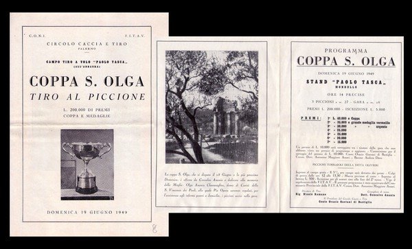 Brochure con programma Circolo Caccia e tiro - Palermo COPPA S.OLGA Tiro al Piccione. 19 giugno 1949