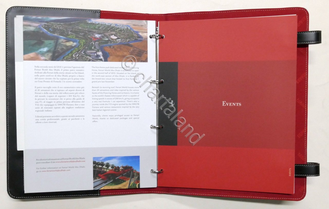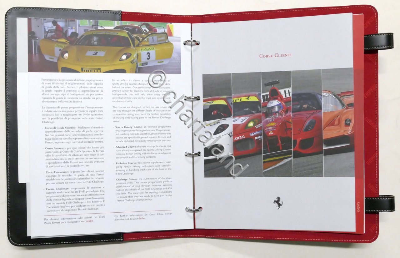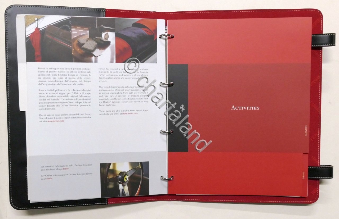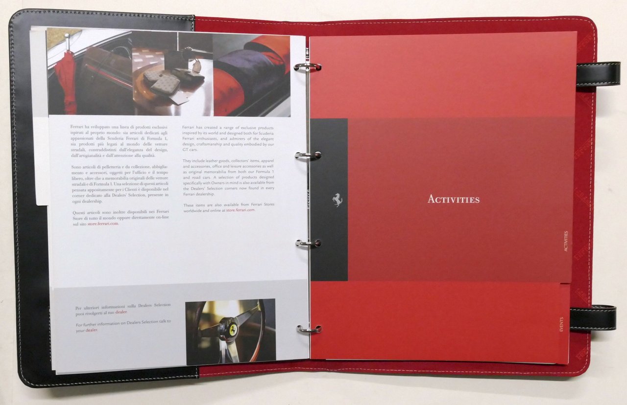 Brochure Benvenuto in Ferrari - Welcome to Ferrari - anni 2000 Raccoglitore ad anelli rivestito in pelle con logo del Cavallino Rampante contenente 16 pagine (alcune ripiegate) suddivise in varie sezioni: intro, services, activities, events. Testo in italiano e inglese corredato da illustrazioni. Condizioni molto buone. Custodia in stoffa allegata.