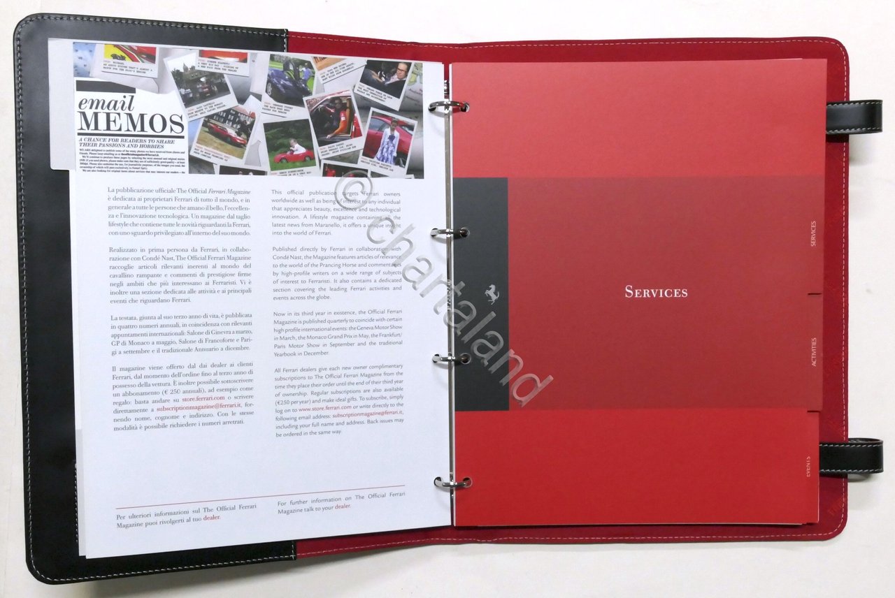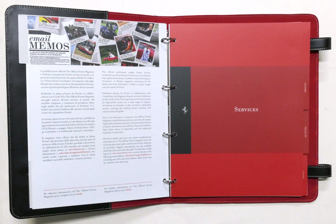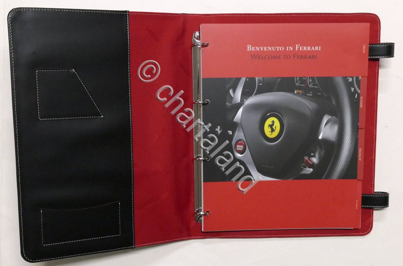 Brochure Benvenuto in Ferrari - Welcome to Ferrari - anni 2000 Raccoglitore ad anelli rivestito in pelle con logo del Cavallino Rampante contenente 16 pagine (alcune ripiegate) suddivise in varie sezioni: intro, services, activities, events. Testo in italiano e inglese corredato da illustrazioni. Condizioni molto buone. Custodia in stoffa allegata.