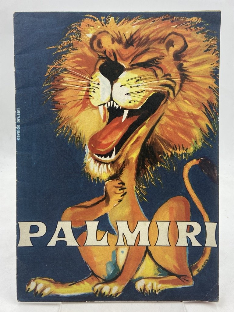 Brossura editoriale illustrata, spillato cm 23.5 x 16.5, pp (16) illustrate a colori e in nero incluse copertine. Brochure promozionale per il circo di Egidio Palmiri (Vado Ligure 1923 - Verona 2020) e Leda Bogino; l’opuscolo non è datato ma gli artisti che presentati sono all’incirca quelli del Circo Palmiri-Benneweis che si esibiva alla fine degli anni ’50 - presumibilmente questa brochure risale alla prima metà degli anni ’60. L’opuscolo è illustrato da Osvaldo Brusati con copertina a colori e vignette in nero e grigio che raffigurano alcuni dei numeri del circo: il domatore Franticek Trubka, il Balletto Davis, gli acrobati Eduardo & Eduardo, Hans Nielsen e i suoi elefanti, i clown musicali I 4 Giachi, il mano a mano dei Concha Concha, i cavallerizzi I Caroli, i domatori I tre Bogino, i saltatori I tre Murillo. Il domatore di leoni Kastensen, le sorelle Zorzan, gli icariani 4 Albertis, la Signora Krag e le sue foche, i clown Paolino e Zezè (Giachi), Lindberg (spettacolo equestre), Ruggero e partner (corda elastica). Al verso del piatto anteriore cenni biografici e fotografia di Egidio Palmiri e Leda Bogino.