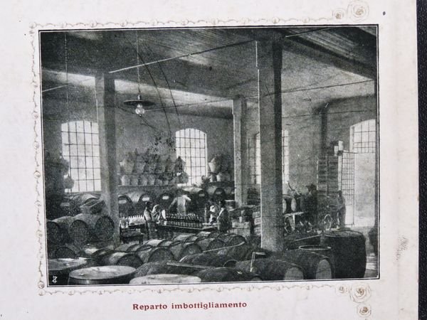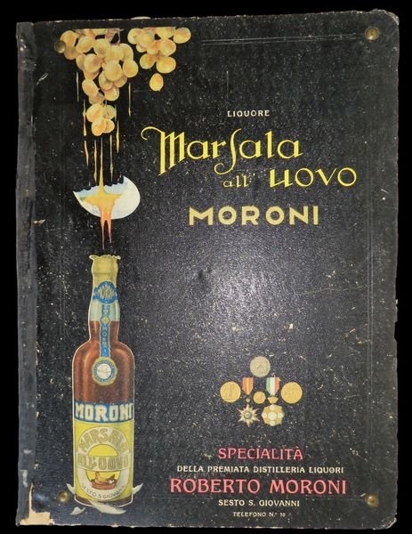 In folio (43,5×31,5 cm); (4) pp. Qualche lieve difetto. Al piatto anteriore bellissima ed elegante immagine del Liquore Marsala allUovo Moroni. Borchie ai quattro angoli dei due piatti. Allinterno immagini dei prodotti della ditta che vengono presentati nella loro bellissima veste grafica, con nome del prodotto, brevi componimenti in rima. Presenti anche 4 vedute degli stabilimenti Moroni sia nei suoi esterni che dellinterno degli stabilimenti, come si presentavano nel 1924. Presente nel margine basso sinistro interno della brochure la marca da bollo con la data ed il timbro 1 Gen. 1924. La distilleria Moroni che fu una delle principali del nord Italia, allinizio del XX° secolo, arrivò a Sesto San Giovanni nel periodo di forte sviluppo dellapparato industriale locale, quando numerosi industriali milanesi, videro nellopportunità di de-localizzare i propri impianti industriali fuori dalla cerchia cittadina di Milano, la possibilità di allargare le strutture industriali e incrementare i guadagni. La scelta di Sesto San Giovanni venne quasi di conseguenza per la vicinanza del paese a Milano e per i ridotti costi dei terreni. La prima ditta che da Milano si spostò a Sesto San Giovanni era anchessa un attività di distilleria, la famosa Campari. Nel breve periodo compreso tra il 1903 e il 1910, si realizza una profond issima trasformazione del territorio di San Giovanni che porta questarea industriale a costituire il quinto polo metallurgico e siderurgico a livello nazionale. Moroni arriva a Sesto San Giovanni nello stesso anno della Pirelli, 1908. Nel 1909 la produzione è già a pieno regime. Gli stabilimenti sorgevano tra via Fratelli Bandiera e la via Moroni che prendeva appunto il nome dalla nascitura ditta. Il suo prodotto più famoso era appunto il Marsala alluovo ma non mancavano anche altri tipi di liquori come il punch e rhum, il liquore al caffè, il Vermouth, lAmaro Felsina, il Kummel, lo sciroppo darancio, lAnesone Triduo, lo sciroppo granatina Sappia, ecc. Molto raro.