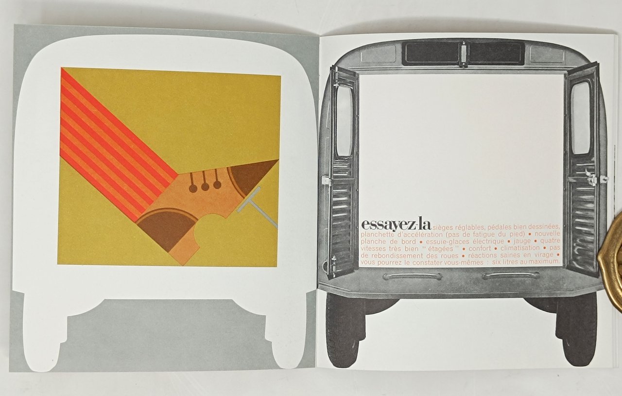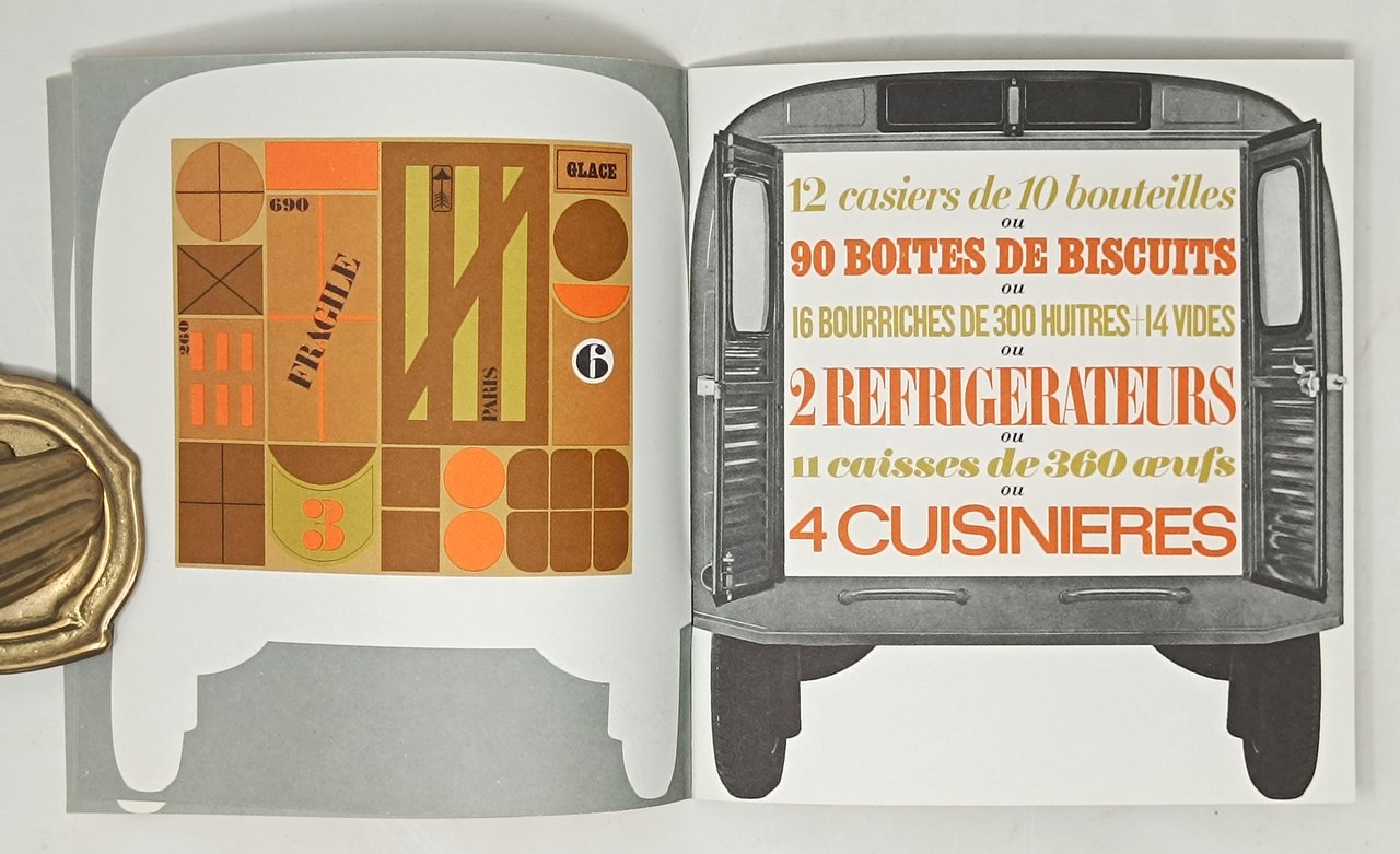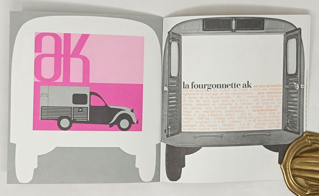 Brochure pubblicitaria originale, di 26 pagine (non numerate) + copertina, delle due varianti (azu e ak) della fourgonnette 2 CV Citroen. La brochure punta ad illustrare la comodità di questi furgoni per i commercianti, illustrandone i punti di forza e le caratteristice tecniche. Volumetto molto grazioso anche dal punto di vista prettamente iconografico (con uno stile illustrativo davvero molto particolare per essere una brochure pubbliciatria di un mezzo di trasporto in quanto i disegni non sono tecnici ma artistici e di grande imatto visivo). A colori. Formato: 16,5 x 18 cm circa. Anno: 1967. Ottimo esemplare (privo di usure). Lingua del testo: francese. Copertina flessibile.