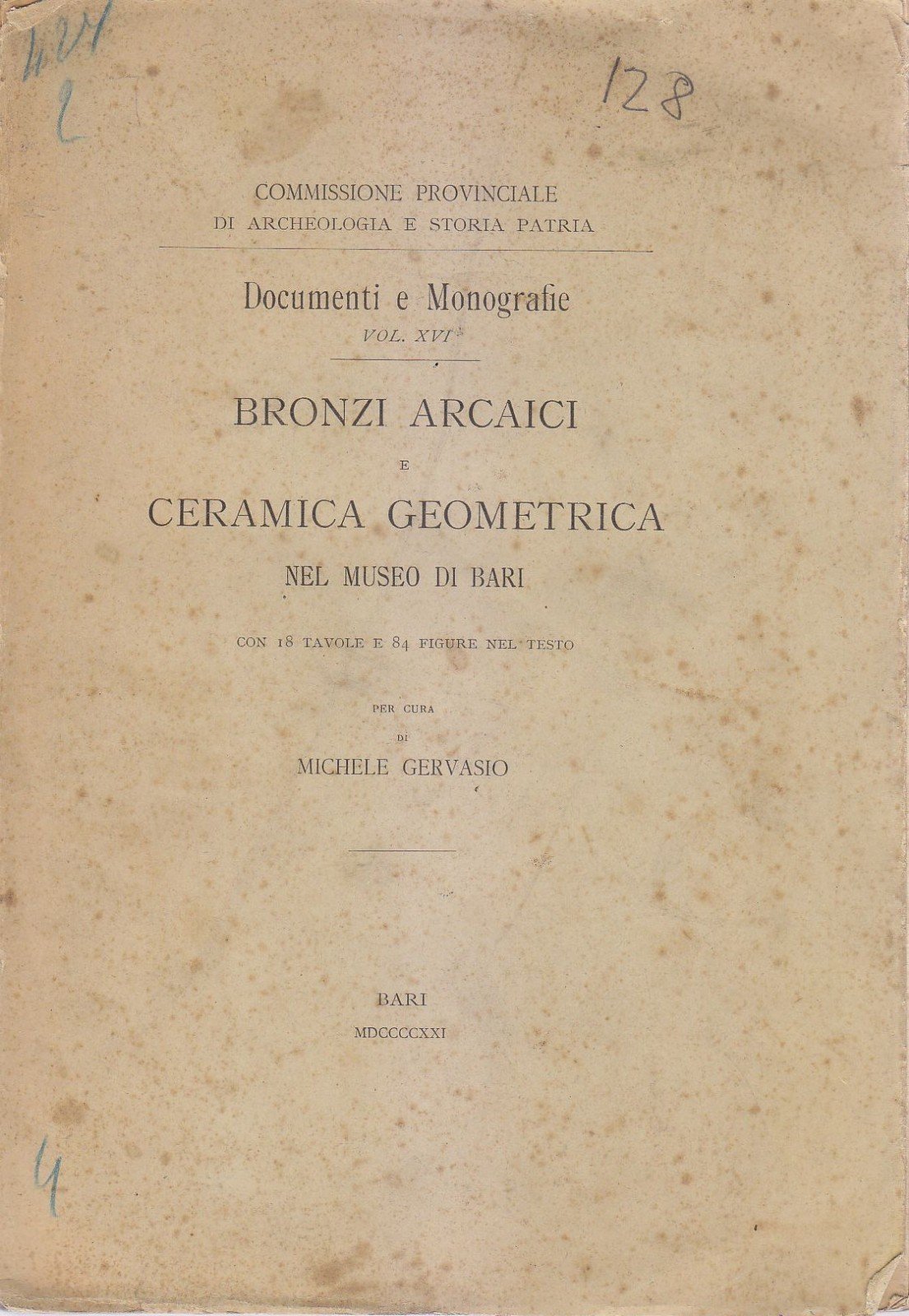 BRONZI ARCAICI CERAMICA GEOMETRICA NEL MUSEO DI BARI 1921 Michele Gervasio libro