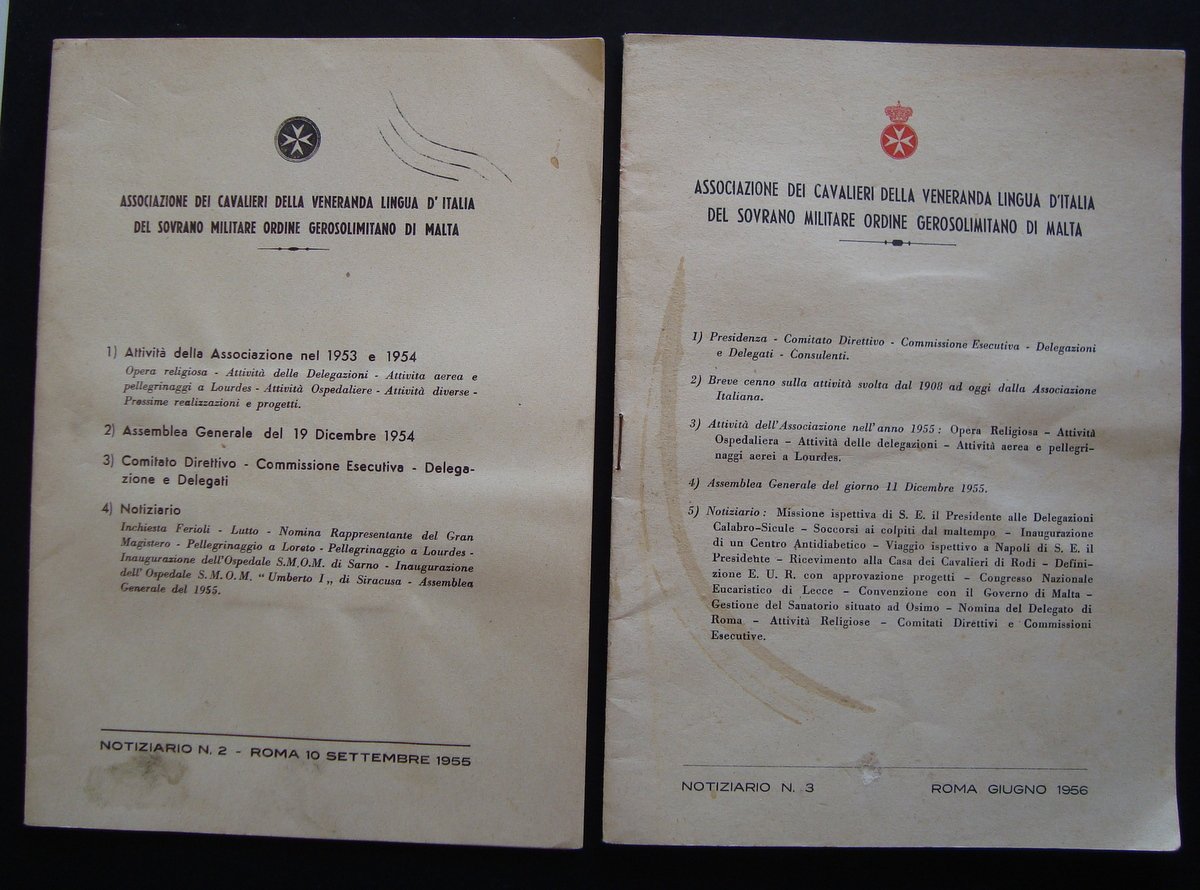 Brossure, CARTA COSTITUZIONALE DEL SOVRANO MILITARE ORDINE OSPEDALIERO DI SAN GIOVANNI DI GERUSALEMME DETTO DI RODI DETTO DI MALTA Grafiche Palazzotti,Roma,1961, cm 24 x 17, pp.42; allegati: Notiziario n.2, Conti, Roma, 1955, cm 24x17, pp.24, Notiziario n.3, Conti, Roma,1956, cm 24 x17, pp 32. Condizioni di conservazione. 3 esemplari ben conservati con leggere tracce d'uso e del tempo, alcune tracce di sporco, piccola mancanza br.ant notiziario n.3 OPEB.2902 BLU
