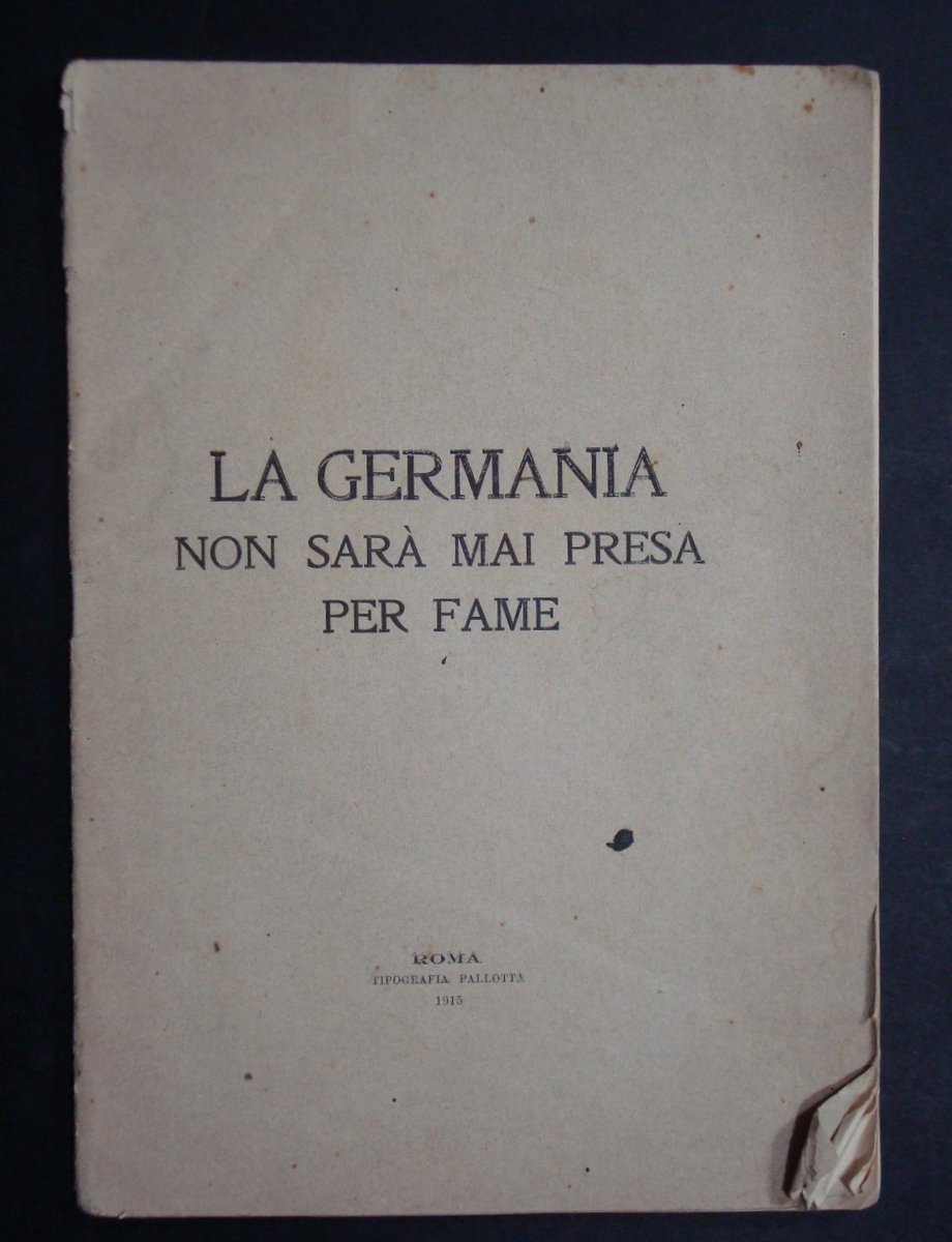 Brossura, LA GERMANIA NON SARA' MAI PRESA PER FAME Tip.Pallotta, Roma, 1915, cm 21,5 x 15, pp 30, brossura ed., Condizioni di conservazione. buono stato con leggere tracce d'uso e del tempo, minimi segni di piega all'angolo inf. e alcune pagine, strappetto alla cuffia sup.del dorso OPEB.2955 BLU