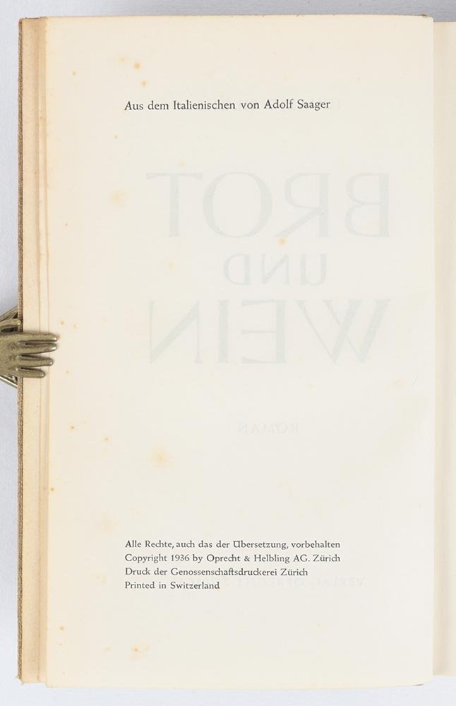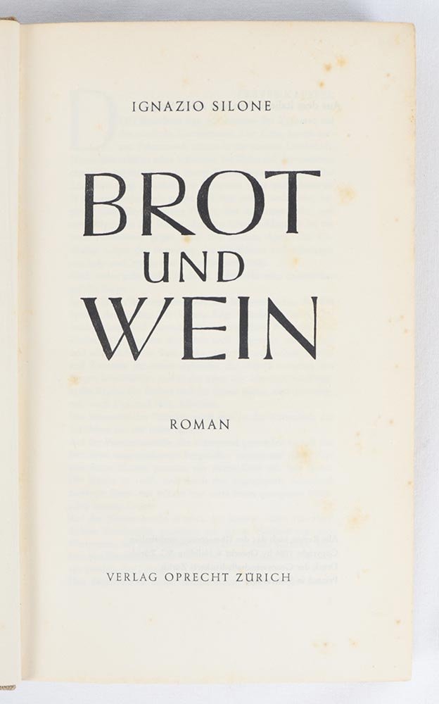 LIBRO Edizione originale, emissione «Verlag Oprecht». Più che buon esemplare; non presente la rara sovracoperta. Secondo romanzo dell’autore, probabilmente il suo capolavoro. Come tutti gli scritti di Silone prima della fine della seconda guerra mondiale, «Pane e vino» apparve in originale nella traduzione tedesca di Adolf Saager. Fu pubblicato in maggio in una larga tiratura dall’editore di riferimento, Emil Oprecht, e a stretto seguito nell’edizione del club del libro «Büchergilde Gutenberg». Bibl.: D’Eramo, Ignazio Silone (Roma 2014), p. 144; Falcetto (cur.), Silone: Romanzi e saggi 1927-1944 (I Meridiani), pp. 1499-1501