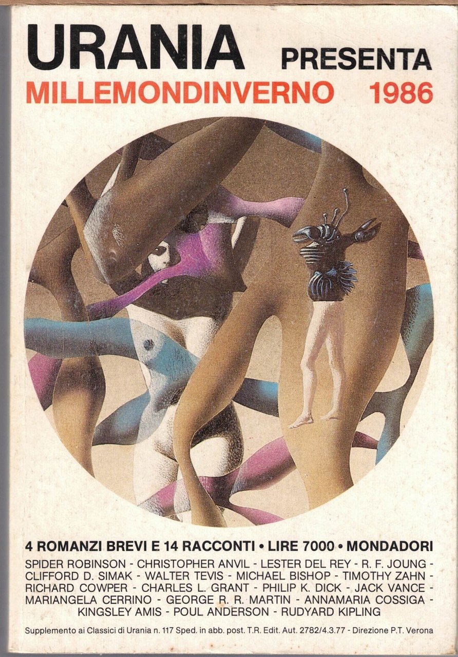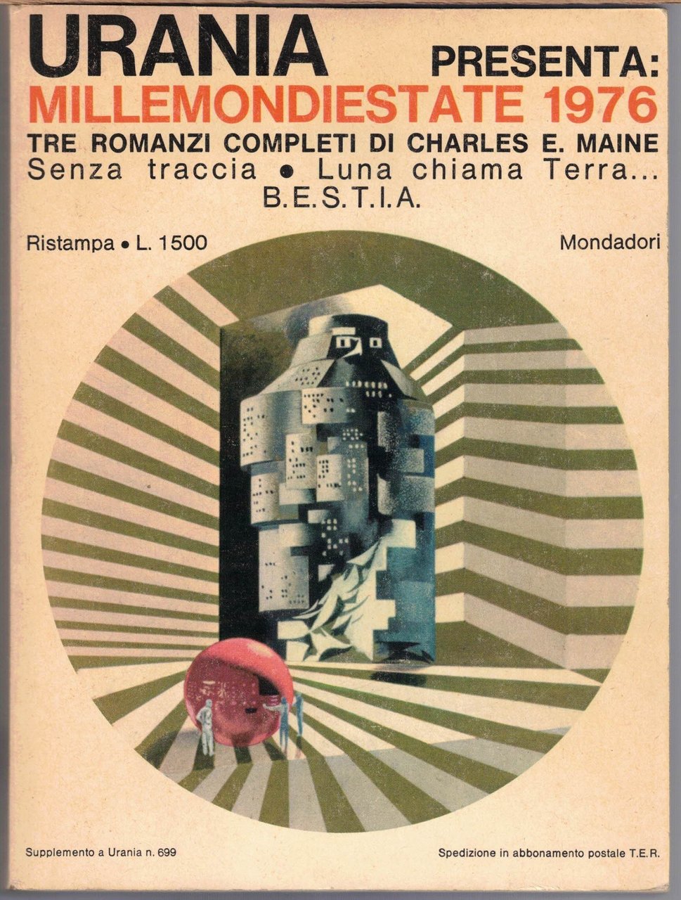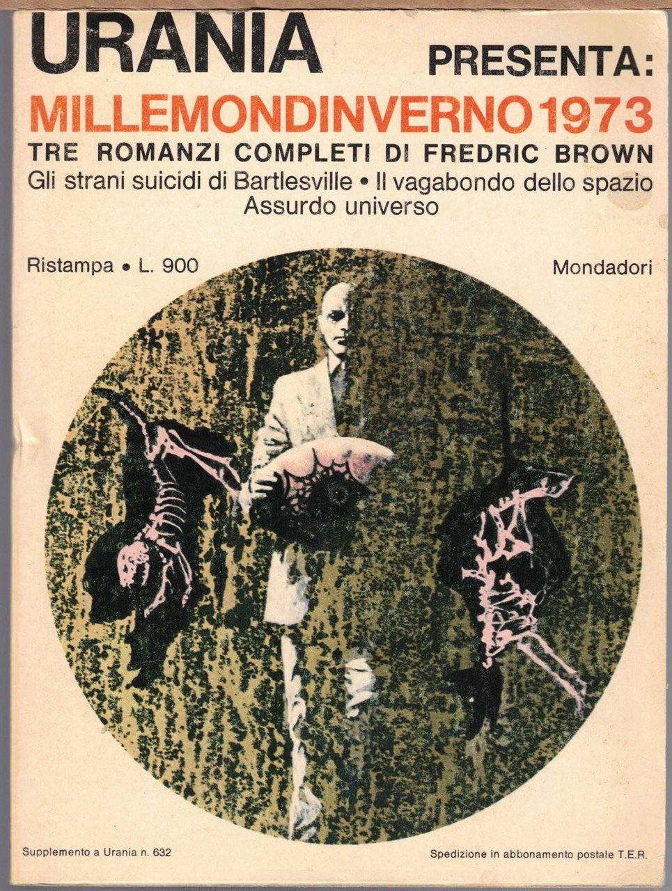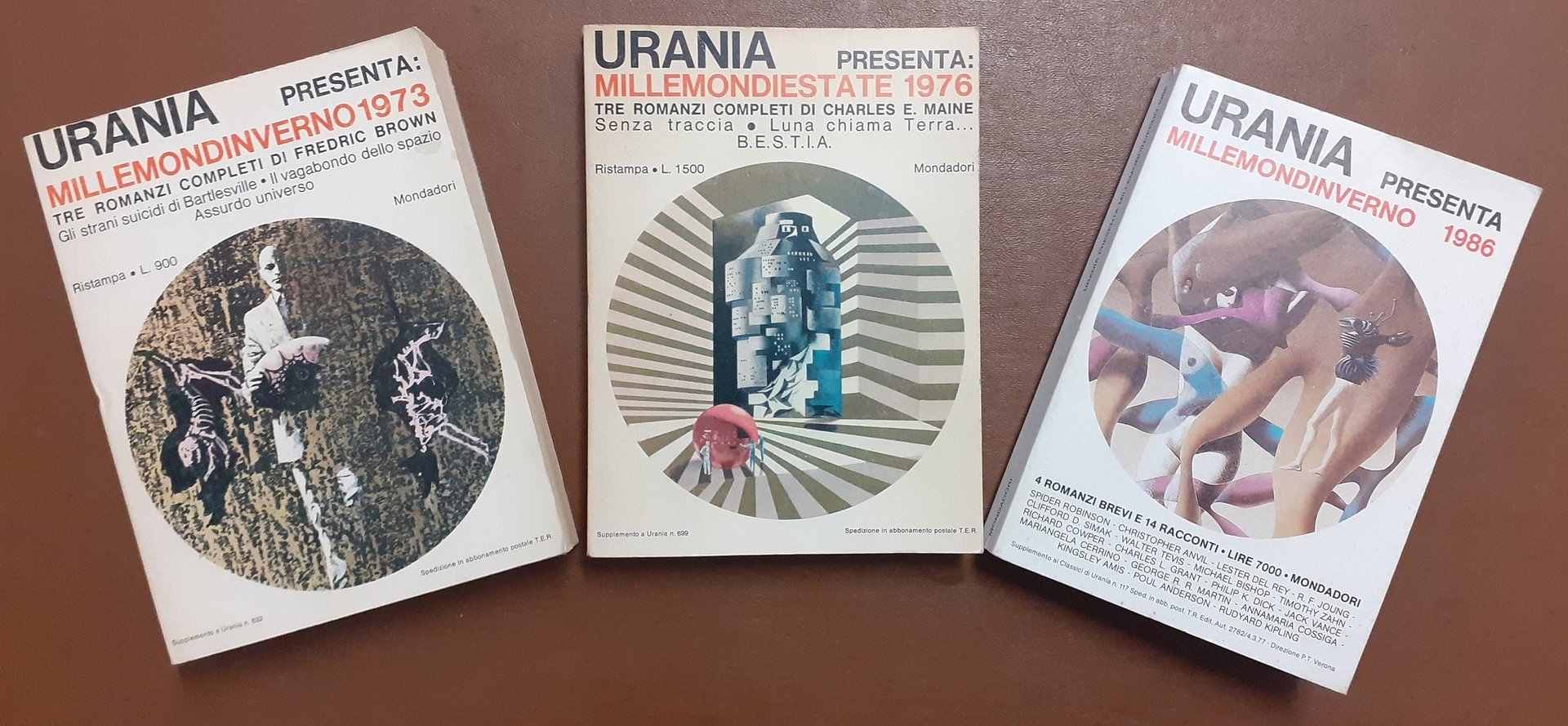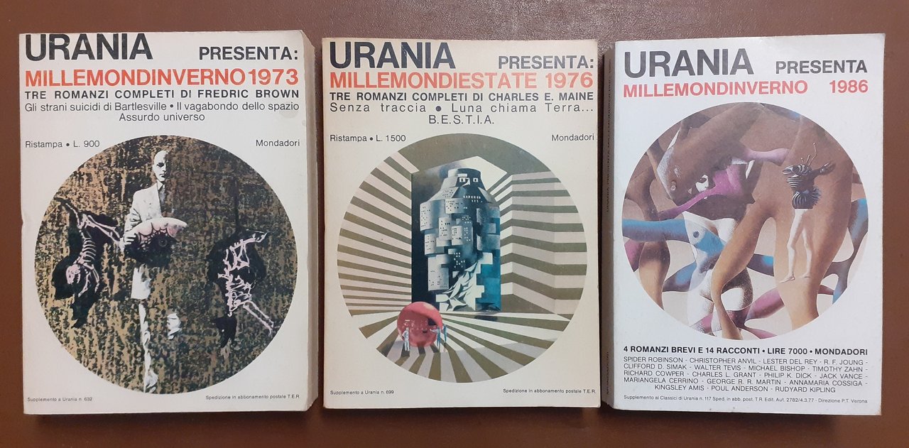 Fredric Brown, Millemondinverno 1973. Tre romanzi completi, Arnoldo Mondadori Editore, Milano 1973, rist., pp. 413, cm 19, br. ed. (Serie Millemondi, supplemento al n. 632 della collana Urania. In testa al frontespizio: Urania presenta. Il volume ospita tre romanzi di Fredric Brown: Gli strani suicidi di Bartlesville - Il vagabondo dello spazio - Assurdo universo. Titoli originali: The mind thing - Rouge in space - What mad universe. Traduzioni di Mario Galli e Adria Mandrini). In lotto con: Charles Eric Maine, Millemondiestate 1976. Tre romanzi completi, Arnoldo Mondadori Editore, Milano 1976, rist., pp. 402, cm 19, br. ed. (Serie Millemondi, supplemento al n. 699 della collana Urania. In testa al frontespizio: Urania presenta. Il volume ospita tre romanzi di Charles Eric Maine: Senza traccia – Luna chiama Terra… – B. E. S. T. I. A. Titoli originali: Subterfuge – High vacuum (traduzione di Andreina Negretti) – B. E. A. S. T. Traduzioni di Andreina Negretti e Mario Galli. In lotto con: Lester del Rey et al., Millemondinverno 1986. Quattro romanzi brevi e 14 racconti, Arnoldo Mondadori Editore, Milano 1986, pp. 395, cm 19, br. ed. (Serie Millemondi, supplemento al n. 117 dei Classici di Urania. In testa al frontespizio: Urania presenta. Il lotto comprende i seguenti tre volumi della serie Millemondi, di Urania: Millemondinverno 1973, Millemondiestate 1976 e Millemondinverno 1986, tutti e tre editi peri tipi della Arnoldo Mondadori Editore, Milano, i primi due come supplementi della collana Urania, voll. 632 e 699, il terzo come supplemento della collana Classici di Urania, vol. 117). Copertine di Karel Thole. Sui primi due volumi, testo su due colonne. Indice Millemondinverno 1986: Lester del Rey, Per vendicare l’uomo (Titolo originale: To avenge man. Traduzione di Annarita Guarnieri) – Spider Robinson, Due teste sono meglio di una (Titolo originale: Two heads are better than one. Traduzione di Chiara Vatteroni) – Jack Vance, Mascherata su Dicantropus (The masquerade on Dicanthropus. Traduzione di Delio Zinoni) – Richard Cowper, Spiaggia paradiso (Titolo originale: Paradise beach. Traduzione di Marco Pensante) – Mariangela Cerrino, Mai verrà la notte – Philip K. Dick, Modello due (Titolo originale: Second variety. Traduzione di Beata della Frattina) – Rudyard Kipling, Con la posta notturna (Titolo originale: With the nightmail. Traduzione di Marco Pensante) – Michael Bishop, Odissea di Catadonia (Titolo originale: Cathadonian Odyssey. Traduzione di Vittorio Curtoni) – Walter Tevis, L’altro capo del filo (Titolo originale: The other and of the line. Traduzione di Delio Zinoni) – Kingsley Amis, Hemingway nello spazio (Titolo originale: Hemingway in the space. Traduzione di Annarita Guarnieri) – Clifford D. Simak, L’albero dei soldi (Titolo originale: The money tree. Traduzione di Cinzia Tani) – Christopher Anvil, Cos’è un nome (Titolo originale: A rose by other name. Traduzione di Annarita Guarnieri) – Anna Maria Cossiga, Non desiderare la donna d’altri – R. F. Young, Pista spaziale (Titolo originale: Spacetrack. Traduzione di Chiara Vatteroni) – Charles L. Grant, Il resto è silenzio (Titolo originale: The rest is silence. Traduzione di Cinzia Tani) – Paul Anderson,cascate di Gibilterra (Titolo originale: Gibraltar falls. Traduzione di Delio Zinoni) – Timothy Zahn, Vittoria vuota (Titolo originale: Hollow victory. Traduzione di Marco Pensante). George R. R. Martin, Manna dal cielo (Titolo originale: Manna from heaven. Traduzione di Annarita Guarnieri). Lievi tracce d’uso, leggera brunitura della carta, per il resto esemplari ben conservati. Ottimo insieme.